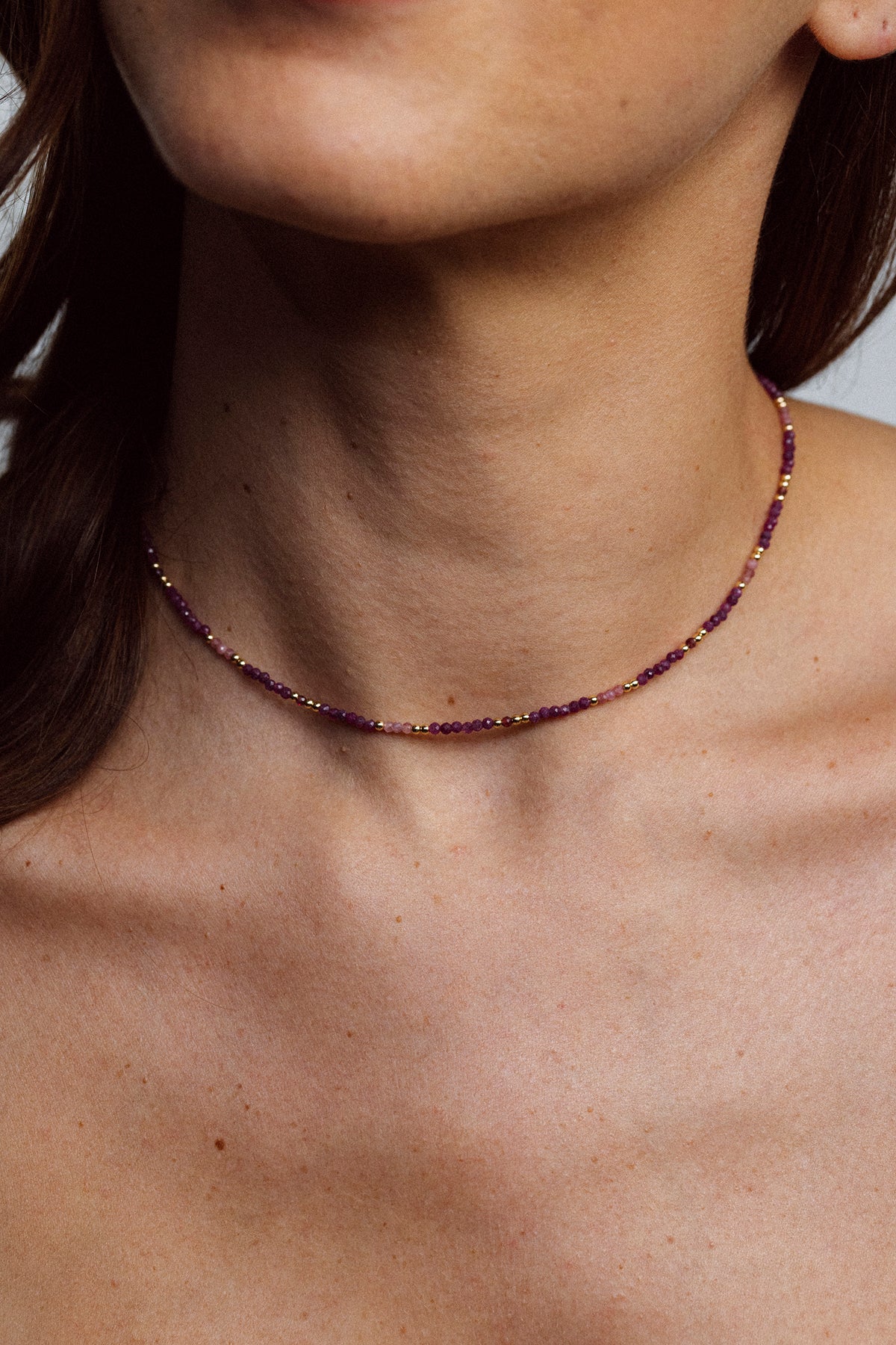 Created from a string of natural stones, the Queen double necklace-bracelet is punctuated with smooth gold beads that bring refinement and brilliance to the piece. Rubies and tourmalines intertwine to form a bold and precious composition. Versatile, this jewel can be worn around the neck or wrist, single or doubled, to adorn any outfit with elegance and modernity.