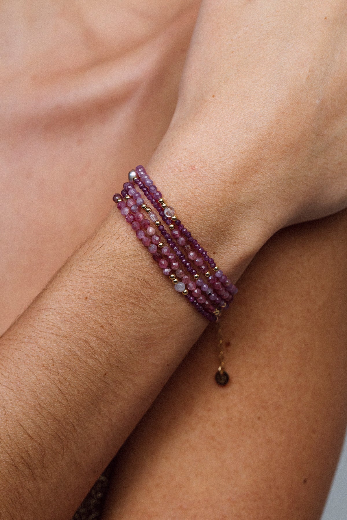 Versatile, this 80cm string of beads showcases a vibrant array of pinks, blending cultured pink pearls, rubies, tourmalines, and jade. Designed as a multi-faceted piece, it can be worn as a long necklace, a double necklace, a five-strand bracelet, or a waist cuff. A lightweight and intuitive piece that encourages creativity and elegantly complements any style.