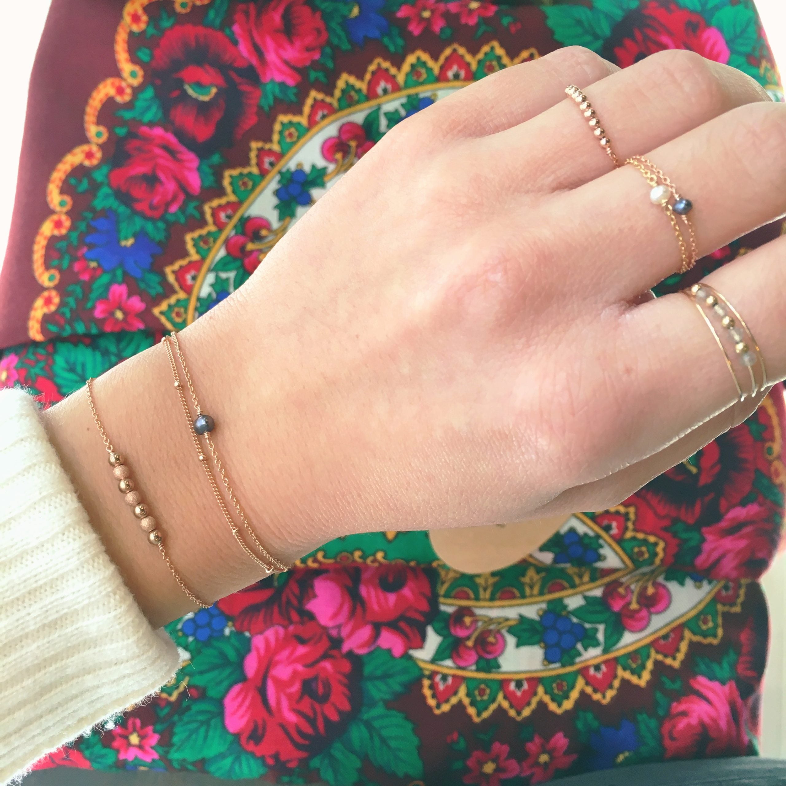 The Stella ring is composed of a gray cultured pearl mounted on a fine gold-plated gold filled chain.