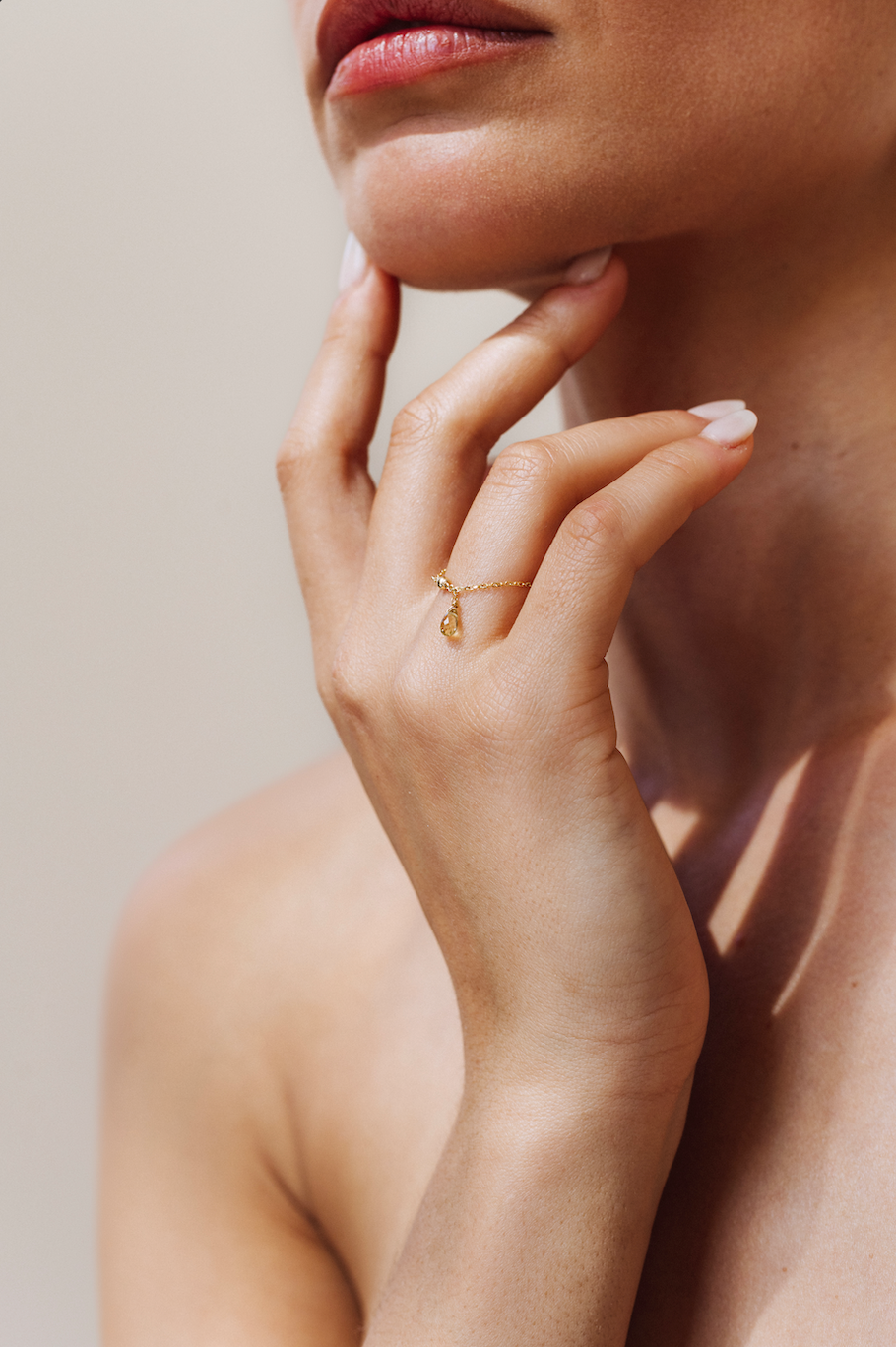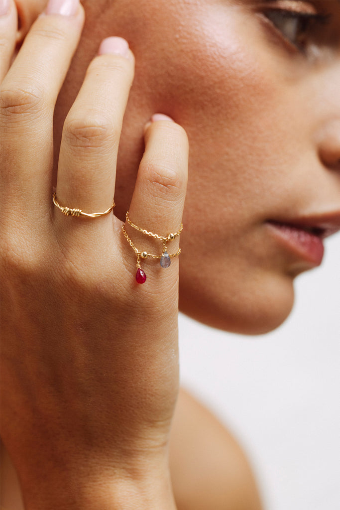 With its delicate design and suspended drop, the Mia drop chain ring captures the essence of minimalist elegance. Adorned with a light pink sapphire, this piece adds a vibrant touch of color to your hand, perfect for those seeking to elevate their everyday style with subtlety.