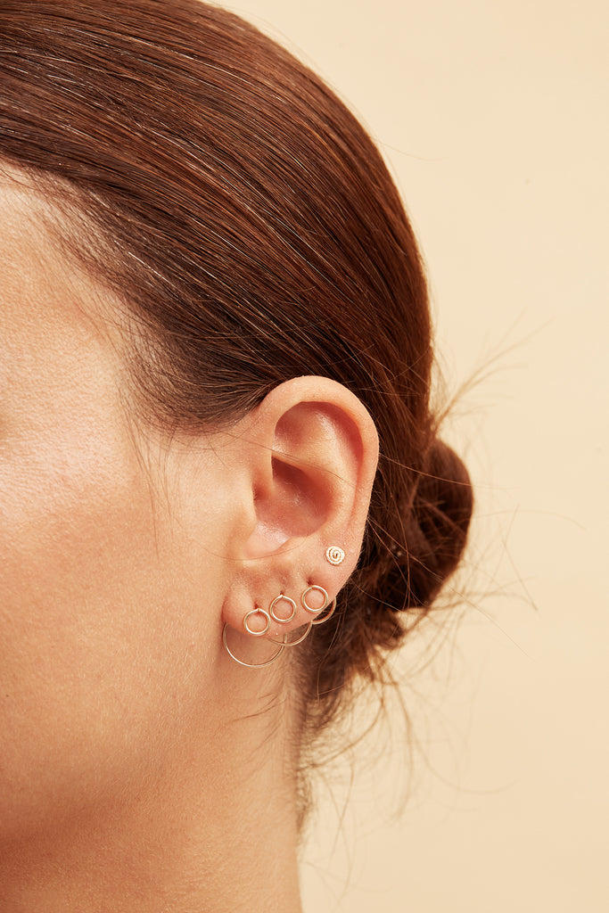 The Moon stack-face earring alone dresses the front and back of the lobe. A small smooth gold ring in front, and a larger one in back.