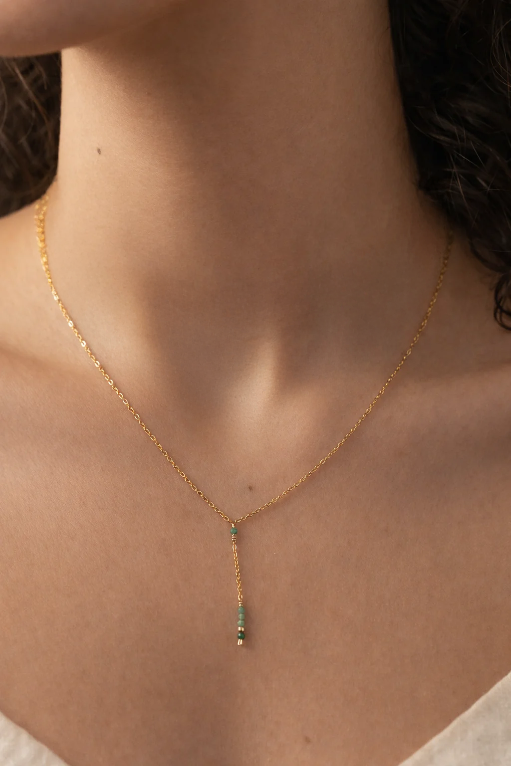 A unique pendant, a composition of natural stones, accented by a gold bead, creates a luminous and precious contrast.