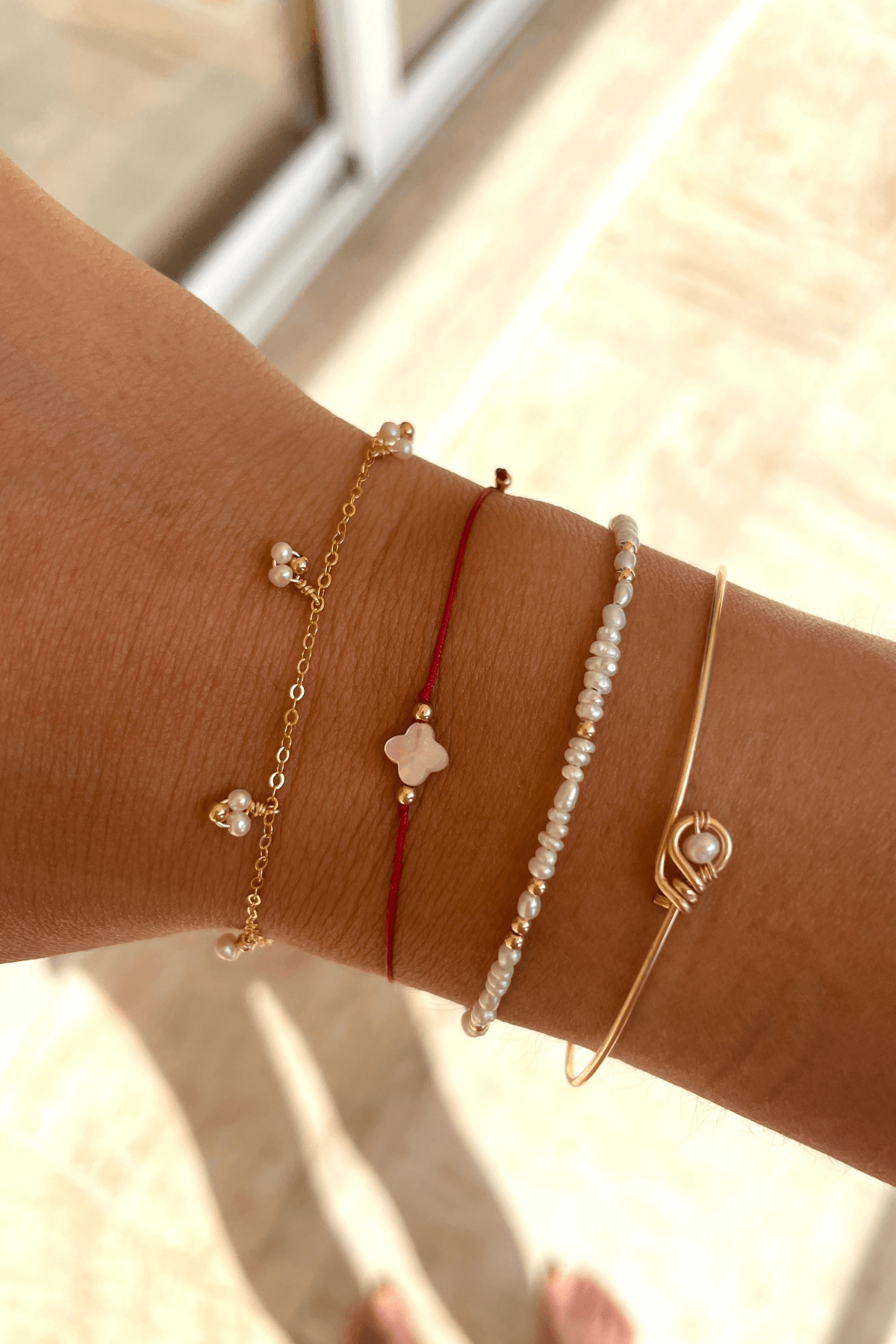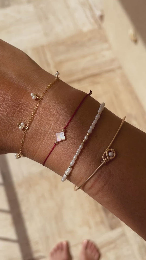 This bracelet is made of a red sliding cord with a mother of pearl star on it.