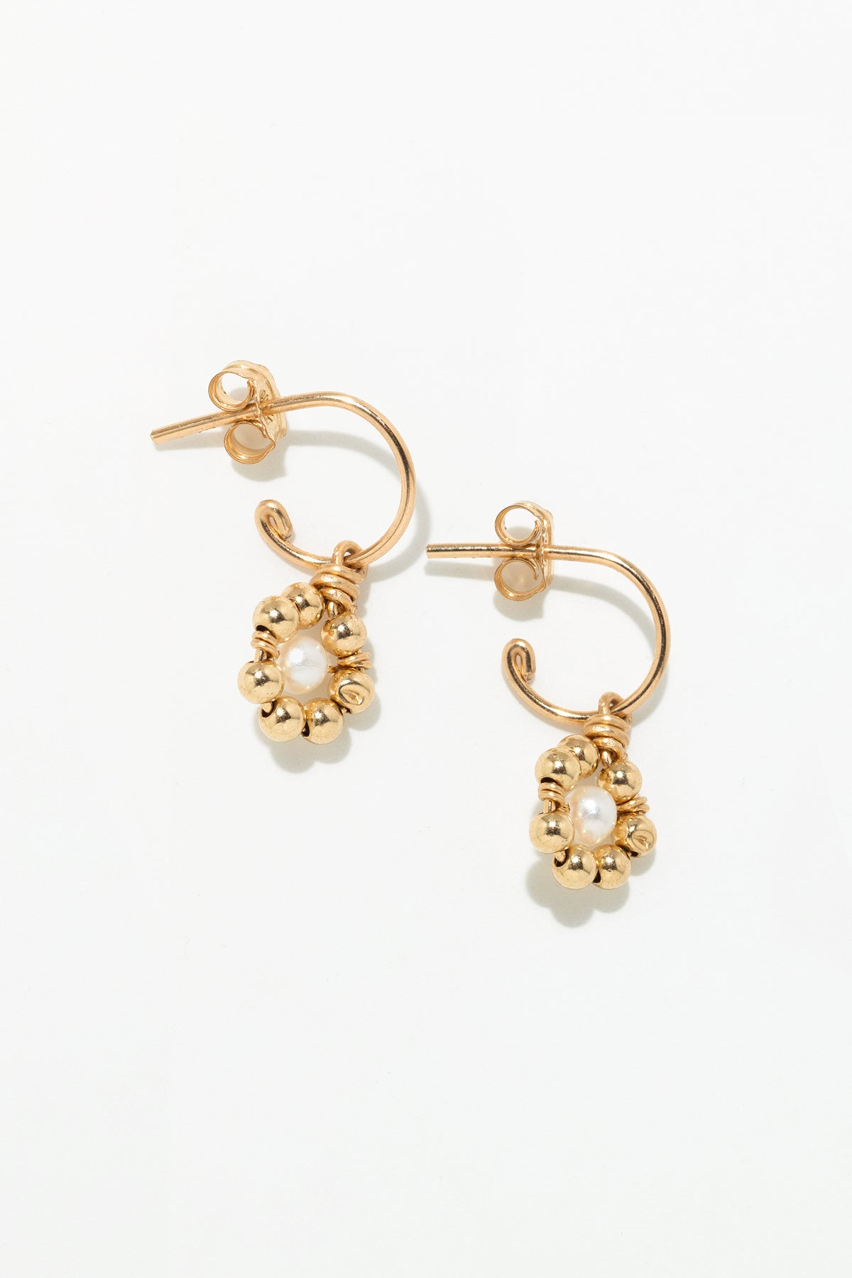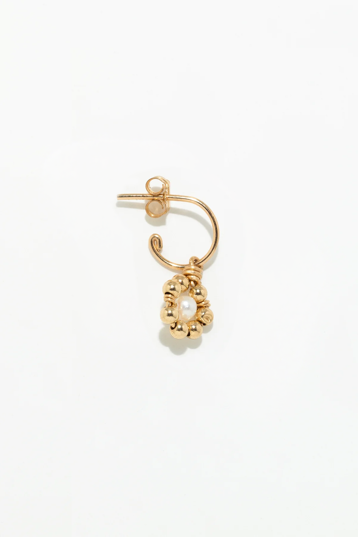 Unique and poetic, the Daisy mini hoop earrings celebrate the art of thread, a signature of YAY's craftsmanship. A floral charm is revealed on a delicate gold ring. At its center, a cultured pearl, surrounded by gold beads, is intricately hand-woven to form a precious flower. A subtle and expressive piece of jewelry, designed to accompany everyday wear.
