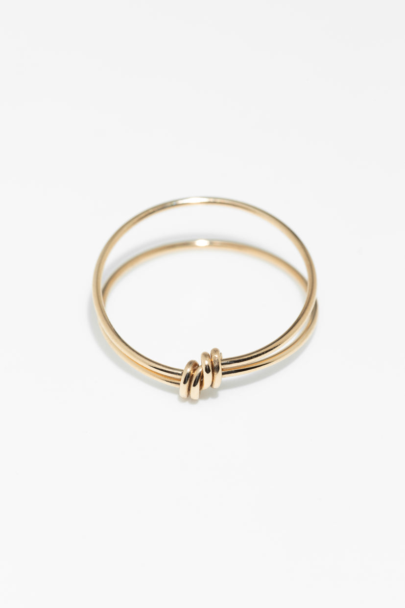 Un seul fil d’or 18 carats se déploie en double anneau avant de se nouer en un élégant nœud, signature de notre art du fil. Façonnée à la main avec précision, cette bague double incarne l’intemporalité et la finesse artisanale, tout en offrant un jeu de lignes subtil sur le doigt.