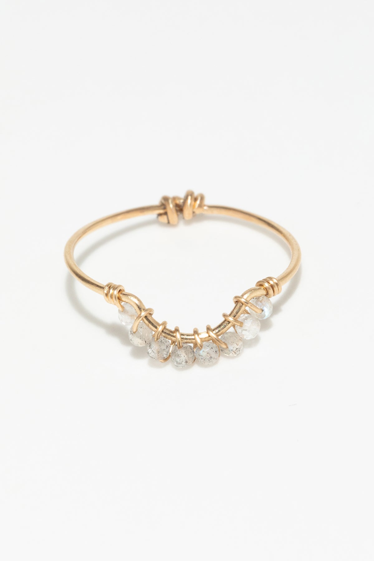Courbe et subtilement tissée de labradorites naturelles, elle se glisse avec grâce autour de n’importe quel solitaire de votre collection, en le soulignant d’un trait de lumière.