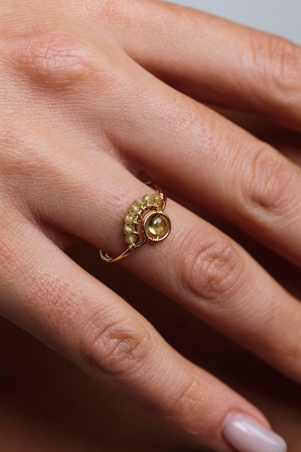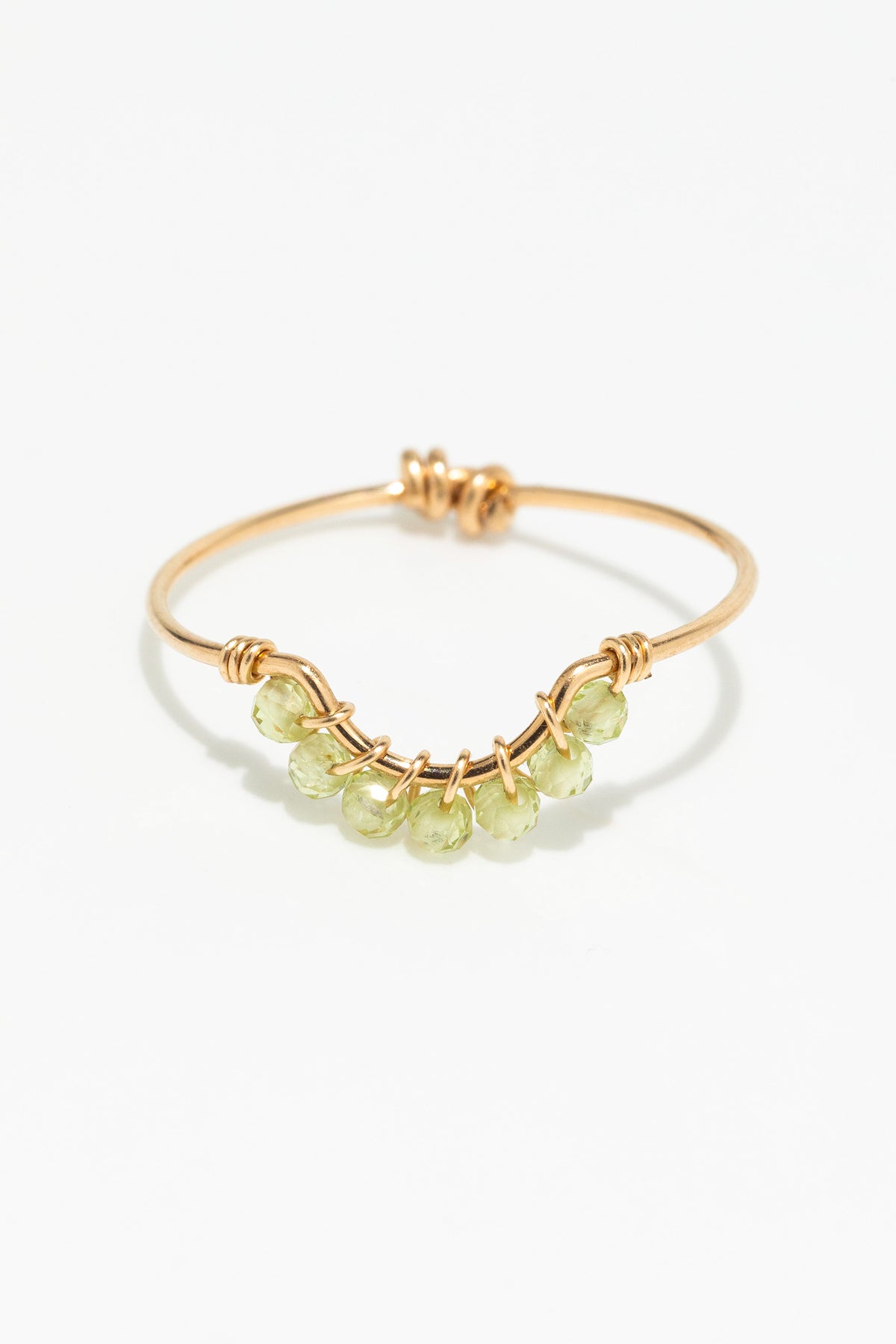 Bijou singulier, la bague Frida met à l'honneur un savoir-faire artisanal propre à la maison, l'art du fil. Motif ajouré et précieux, le tissage de péridots sur un fil d'or dessine une courbe gracieuse qui épouse délicatement la forme du doigt.