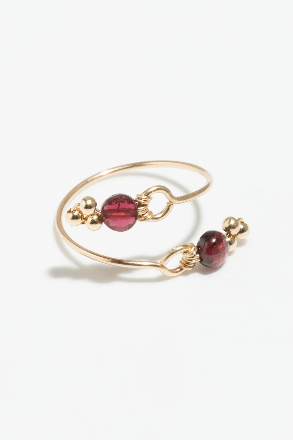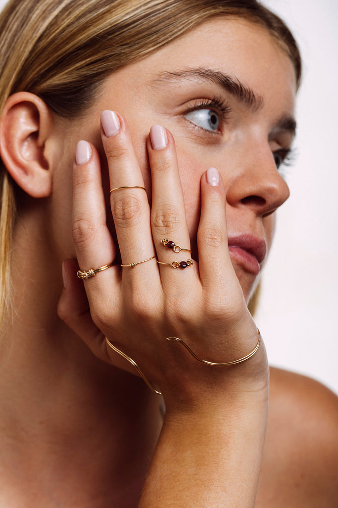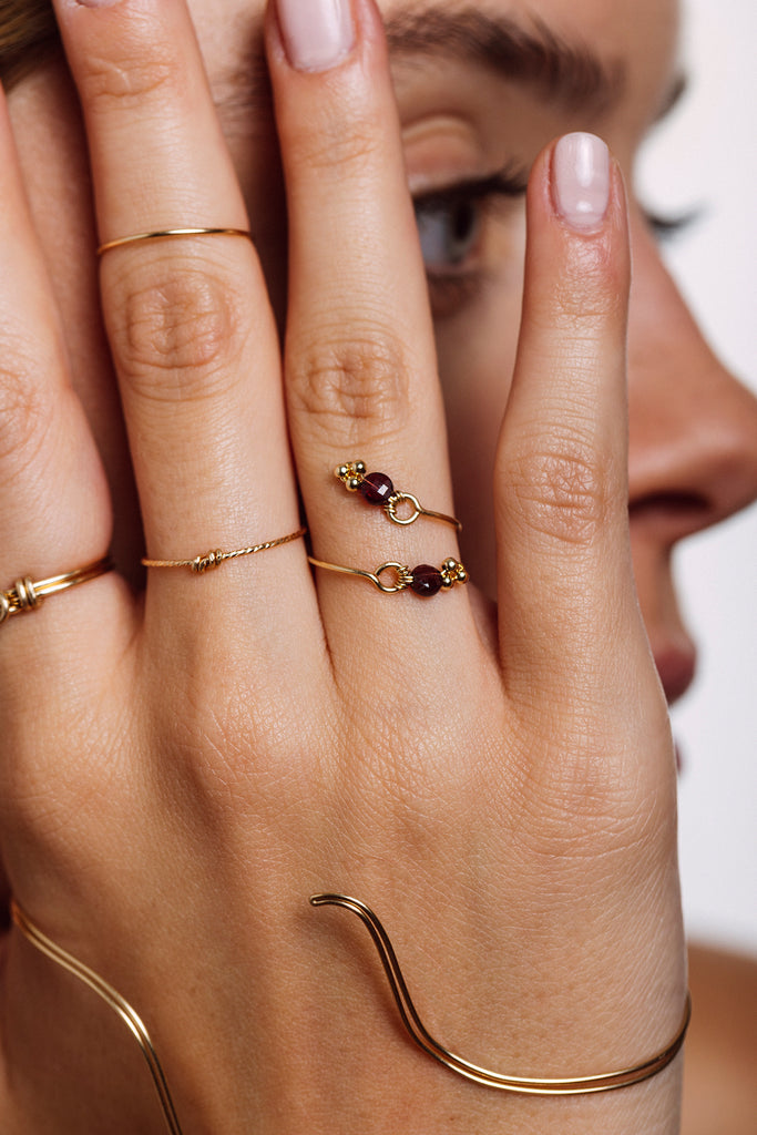 Deux grenats facettés qui se répondent et se superposent sur le devant du doigt, comme une rencontre précieuse.