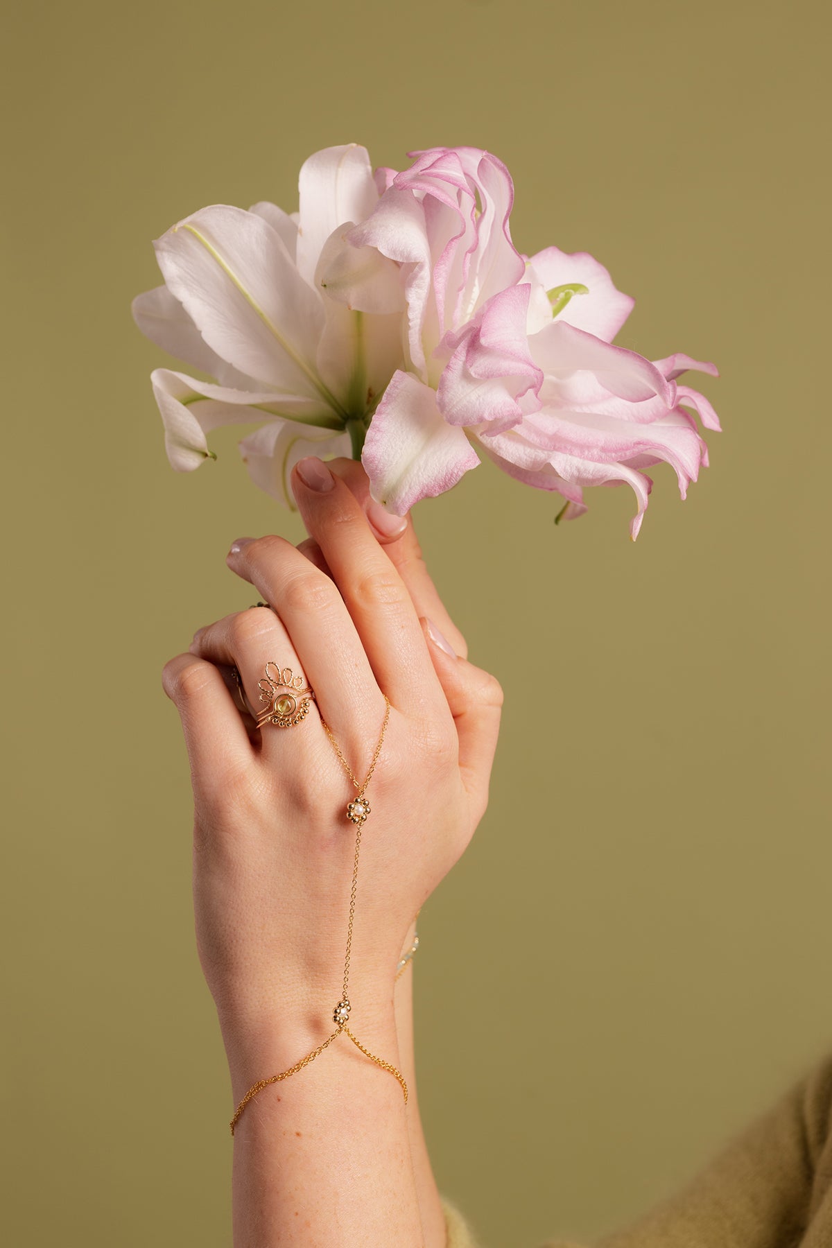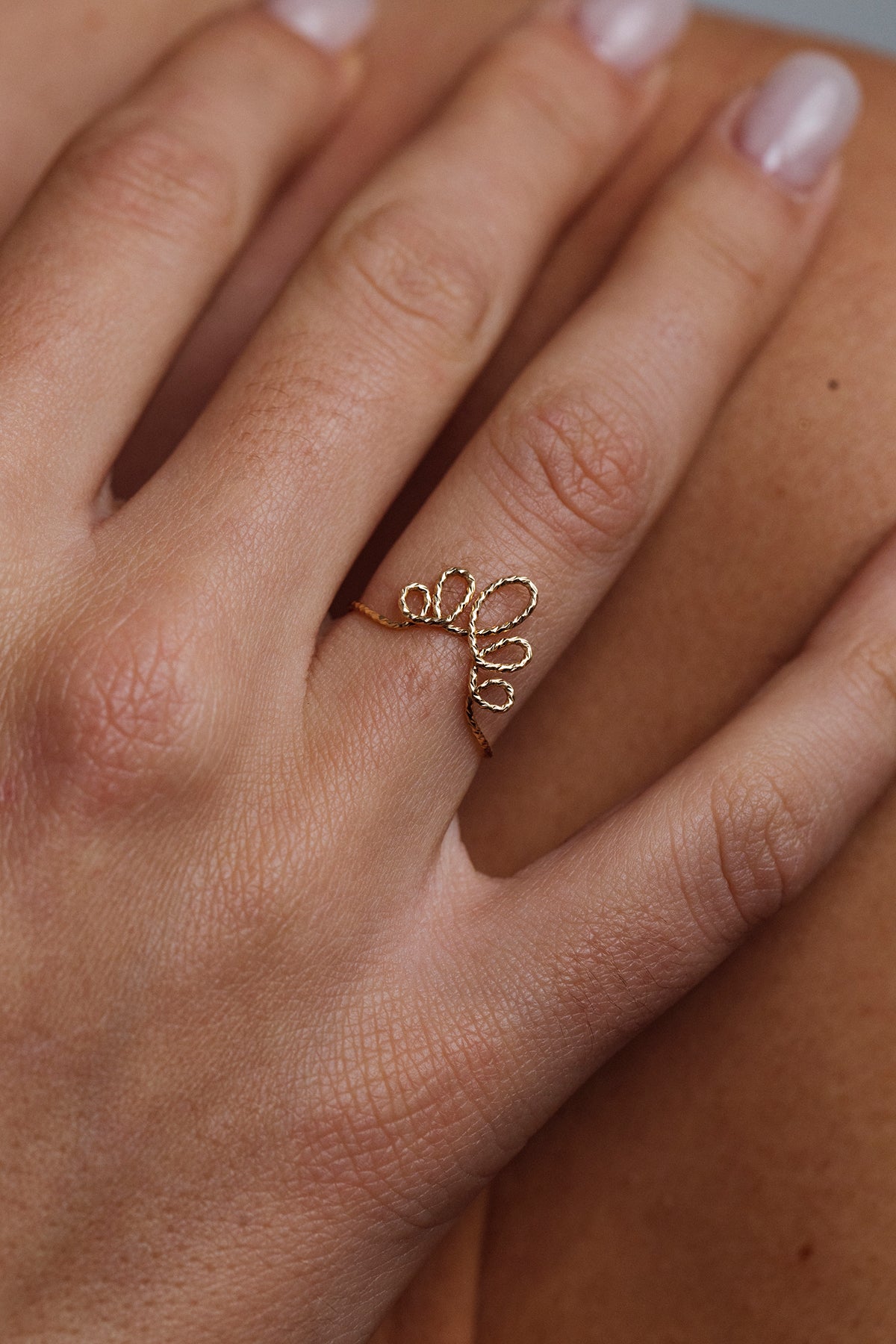 La bague Pétale éclat met en lumière l’art du fil, savoir-faire emblématique de la maison. Réalisée en fil d'or à l’effet subtilement scintillant, elle se compose de cinq boucles formant un motif léger et organique, de pétale.