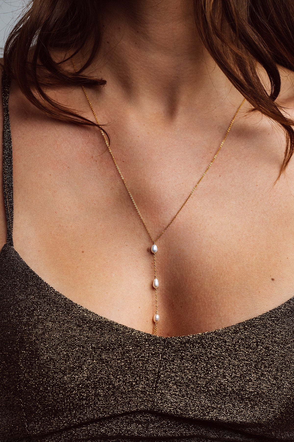 Le bijou de corps grain de riz est composé d'une chaîne en or laminé, incrustée de trois perles de culture en forme de grain de riz sur l'avant du bijou et d'une perle de culture incrustée au niveau de la nuque.