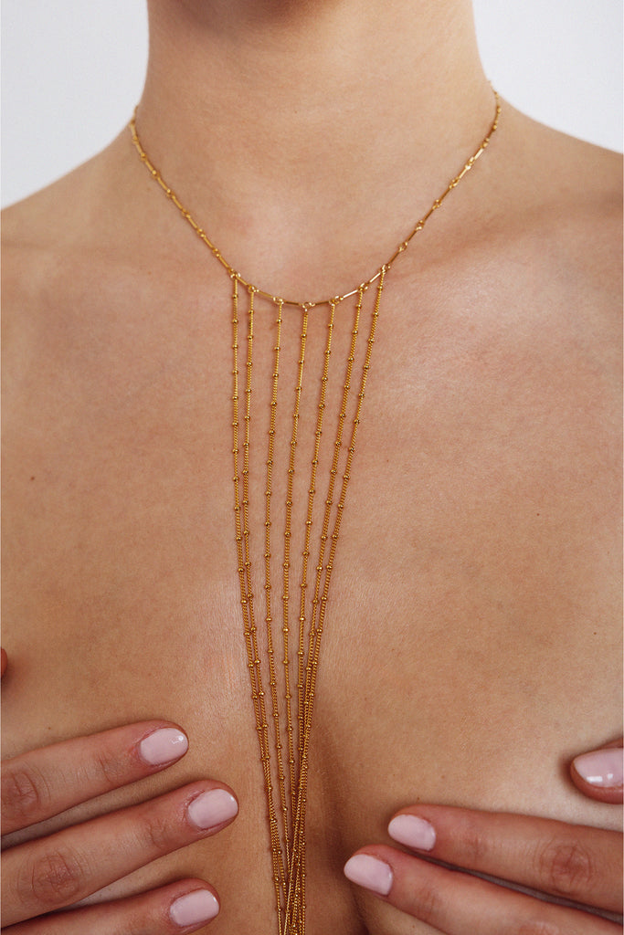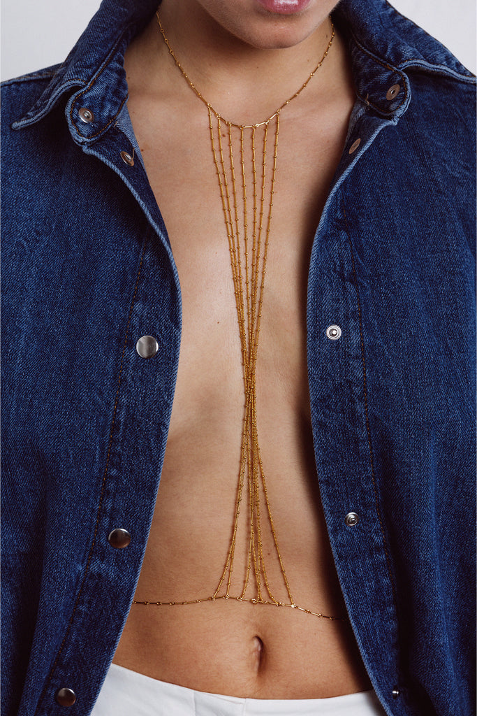 Composé de chaînes délicates, ce bijou de corps Tess dessine des lignes graphiques sur la peau. Inspiré de l’allure d’une combattante du désert, il évoque une féminité forte, assumée, en mouvement.