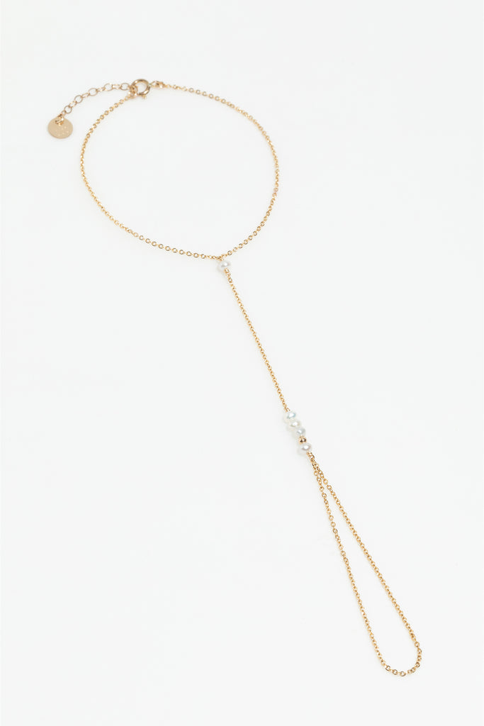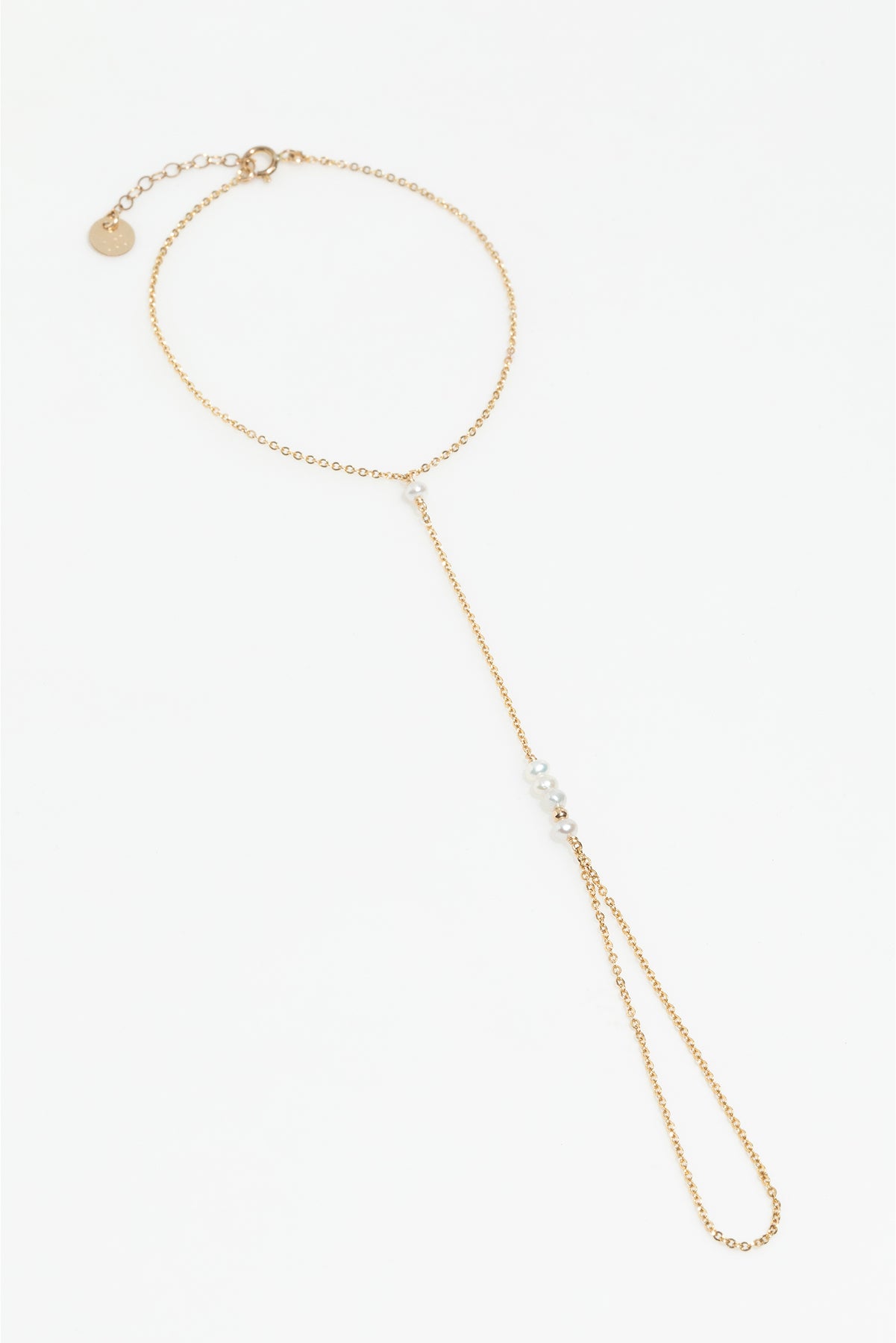 D'élégantes perles de culture sont nouées sur un délicat fil d'or pour habiller le dos de la main.