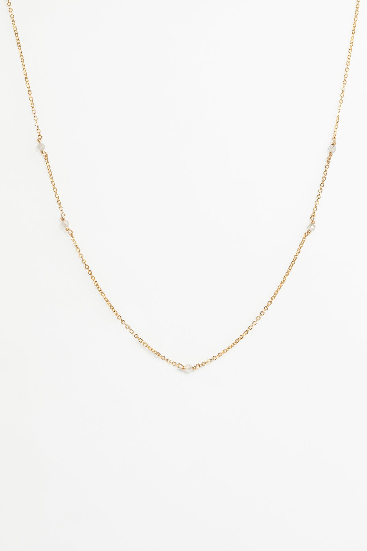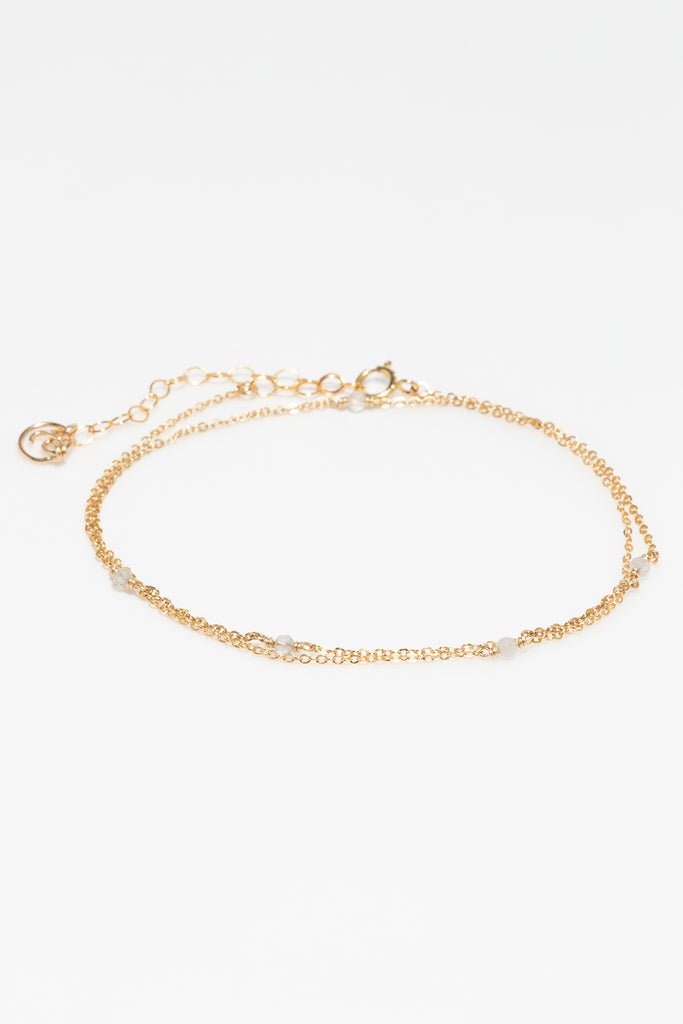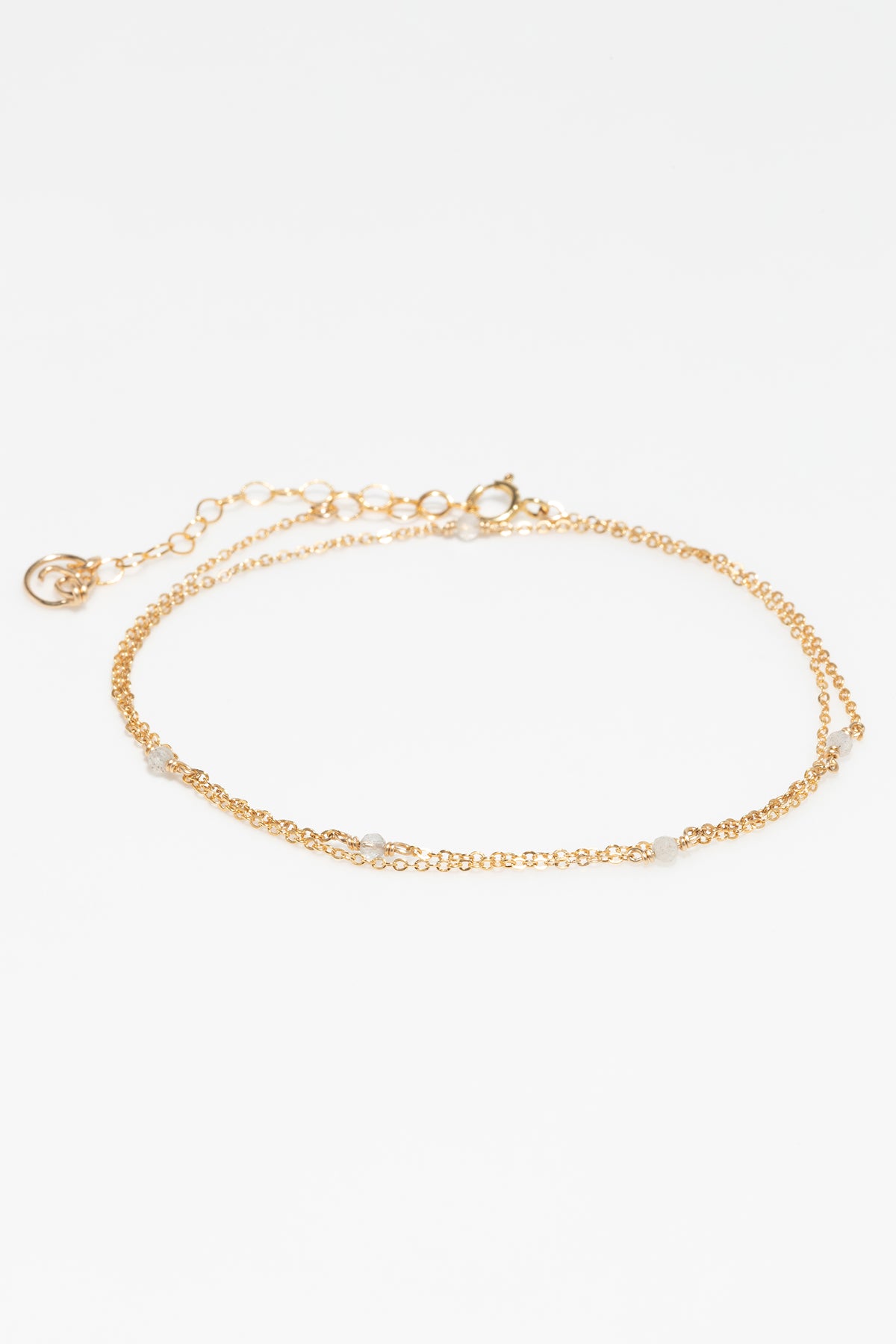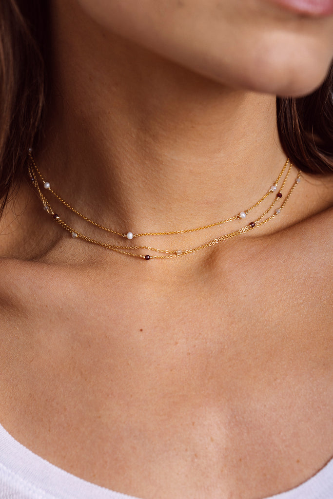 Fine chaîne d'or, il s'anime avec élégance grâce au nouage périodique de pierres naturelles rondes et facettées. Multi-positions, ce bijou habille le cou ou le poignet d'un simple ou double tour.