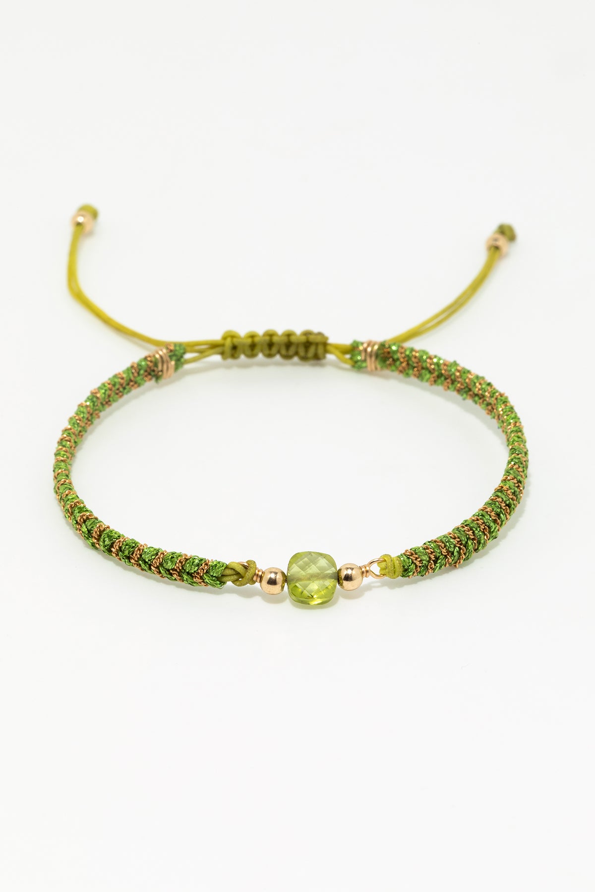 Un péridot vif capte la lumière au cœur d’un tressage mêlant cordon coloré et chaîne gourmette.