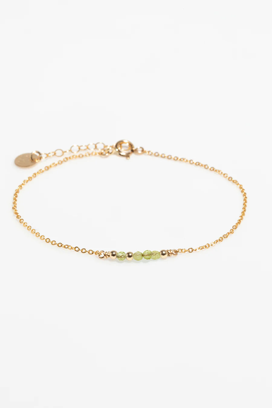 Le bracelet Théa se pare de fines pierres de péridot facettées, délicatement nouées sur un fil d’or. Une perle d’or vient rythmer la composition et apporter une touche d’éclat.