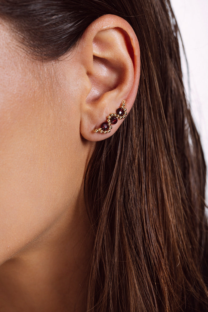 Élégance et délicatesse se rencontrent dans ce climber d’oreille Gaïa pensé pour un seul perçage. Montant le long du lobe, il dévoile trois grenats facettés, subtilement entourés de petites perles lisses. L’alliance crée un effet raffiné, évoquant la grâce d’un bouquet délicat. Chaque bijou Yay est unique, fabriqué à la commande par un artisan de notre atelier, pour vous. 🇫🇷