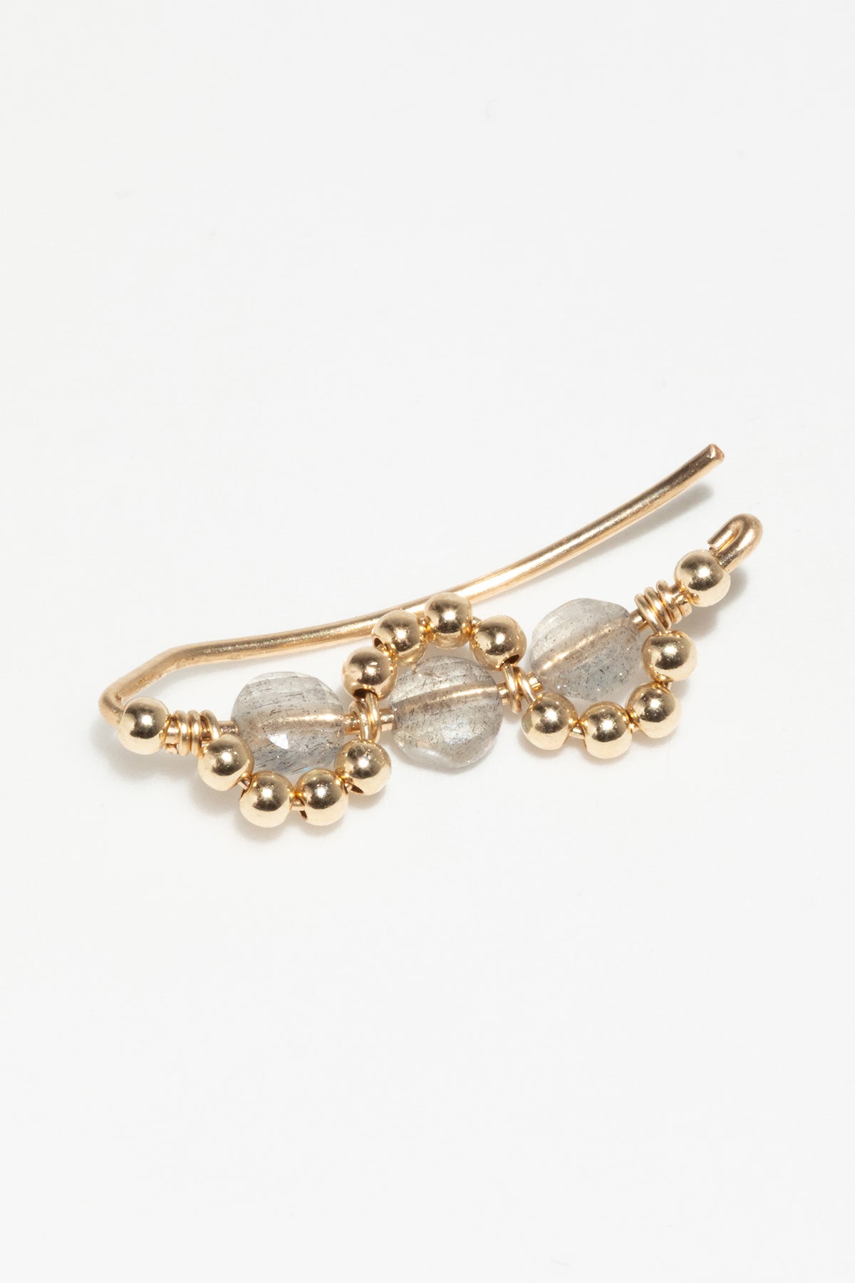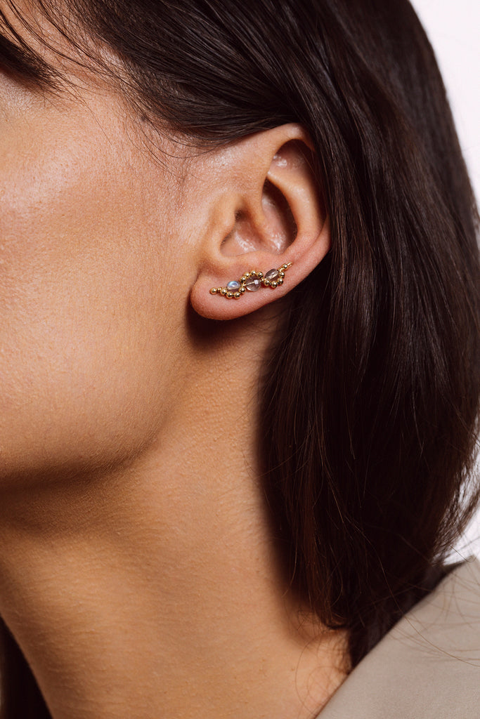 Élégance et délicatesse se rencontrent dans ce climber Gaïa pensé pour un seul perçage. Montant le long du lobe, il dévoile trois labradorites facettées, subtilement entourées de petites perles lisses. L’alliance crée un effet raffiné, évoquant la grâce d’un bouquet délicat.