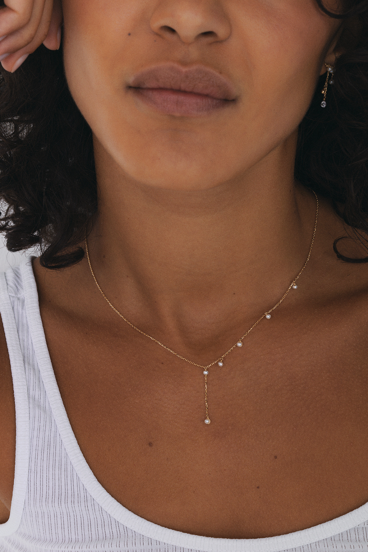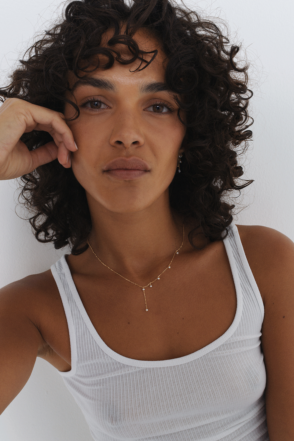 Collier cravate en or 18 carats, alliant raffinement et audace. Sur un seul côté de la chaîne, de fines pampilles de perles de culture se balancent délicatement, créant un jeu d’asymétrie subtil et lumineux. Une pièce à la fois contemporaine et intemporelle, pensée pour illuminer le port de tête et sublimer chaque mouvement avec élégance.