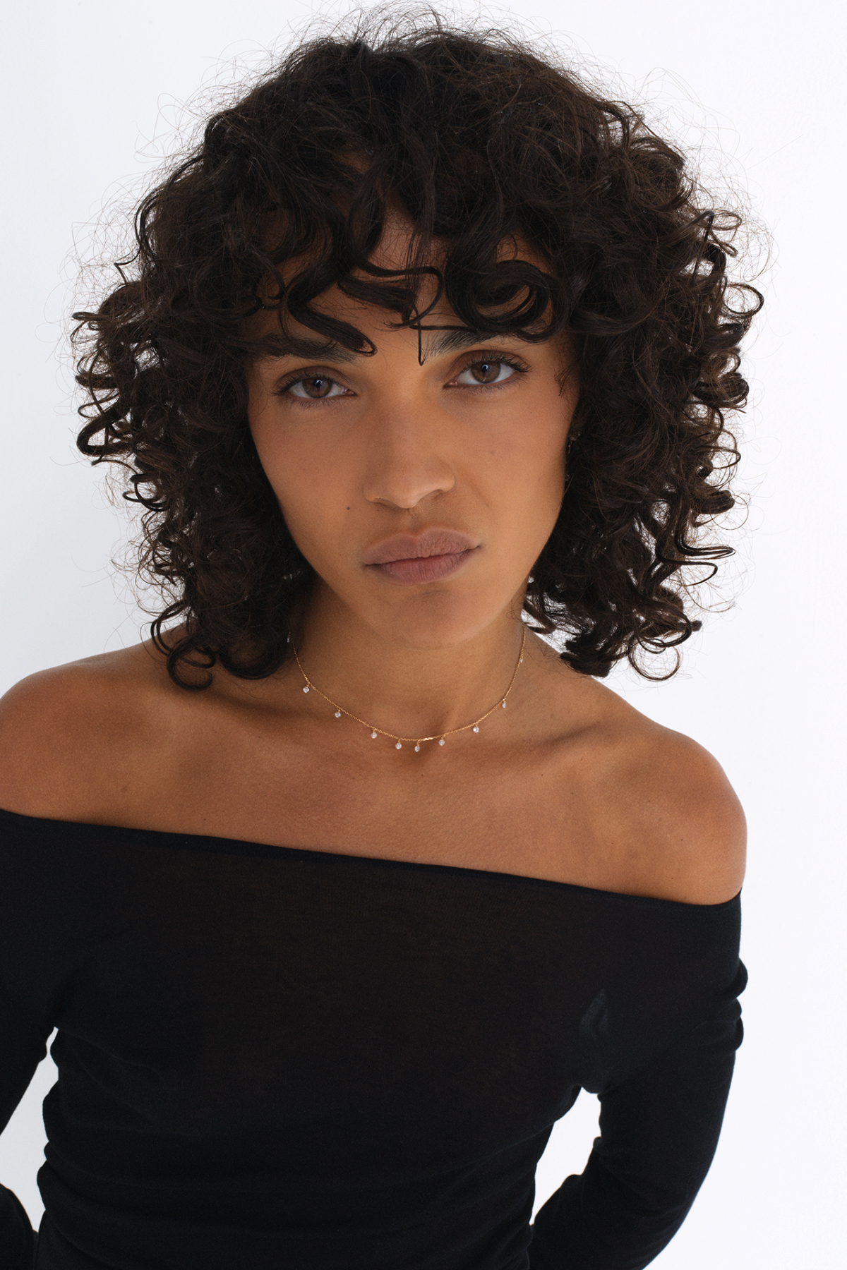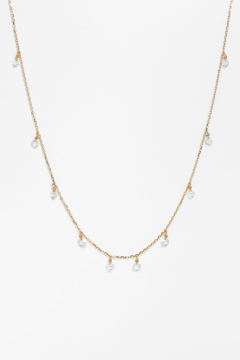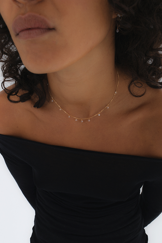 Le collier Éloïse en or 18 carats déploie une élégance subtile, sublimée par dix diamants blancs en pampille qui scintillent à chaque mouvement.