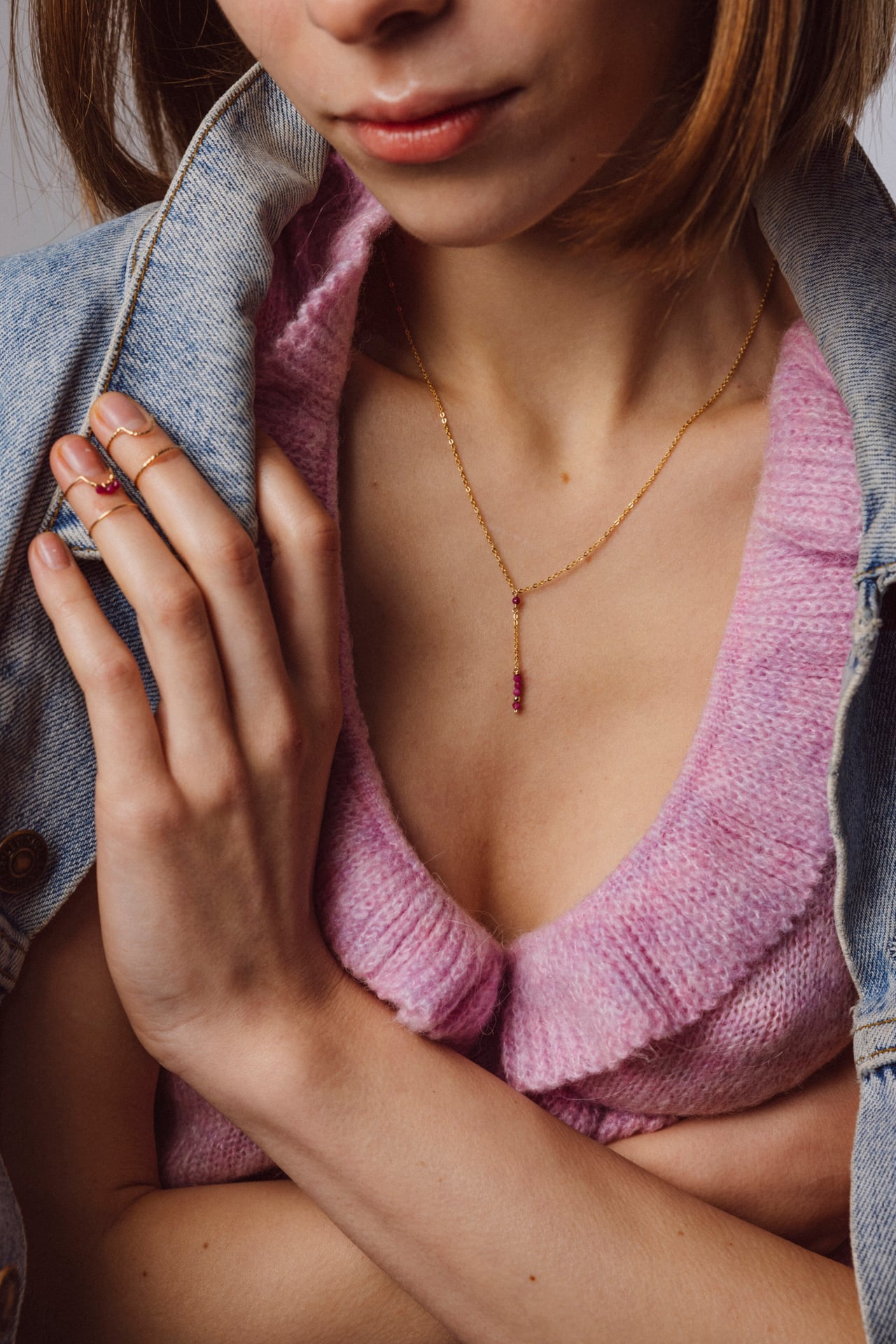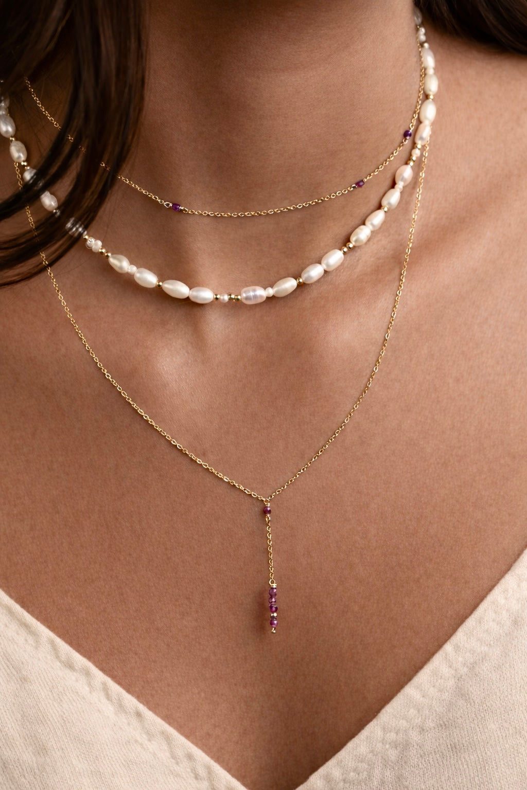 Léger et élégant, le collier long cravate parcourt délicatement le décolleté.