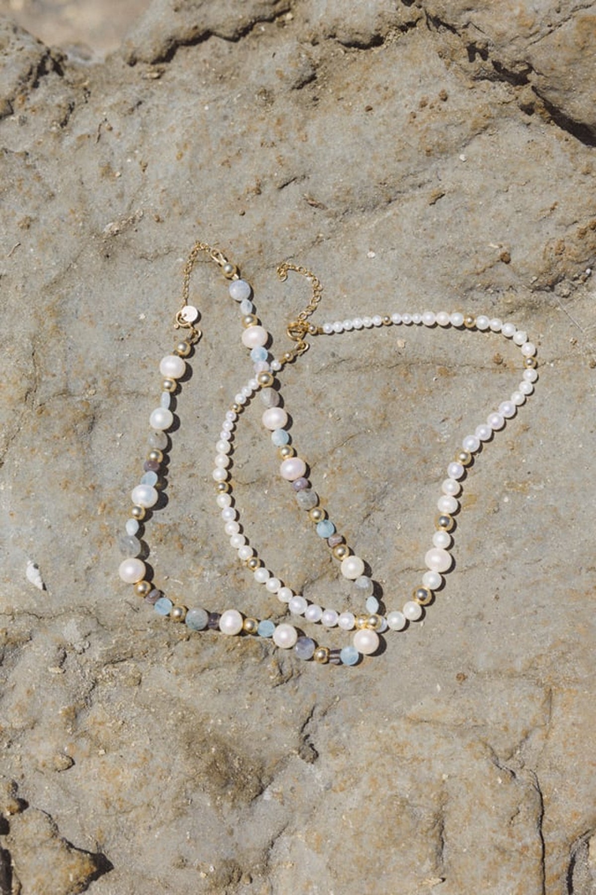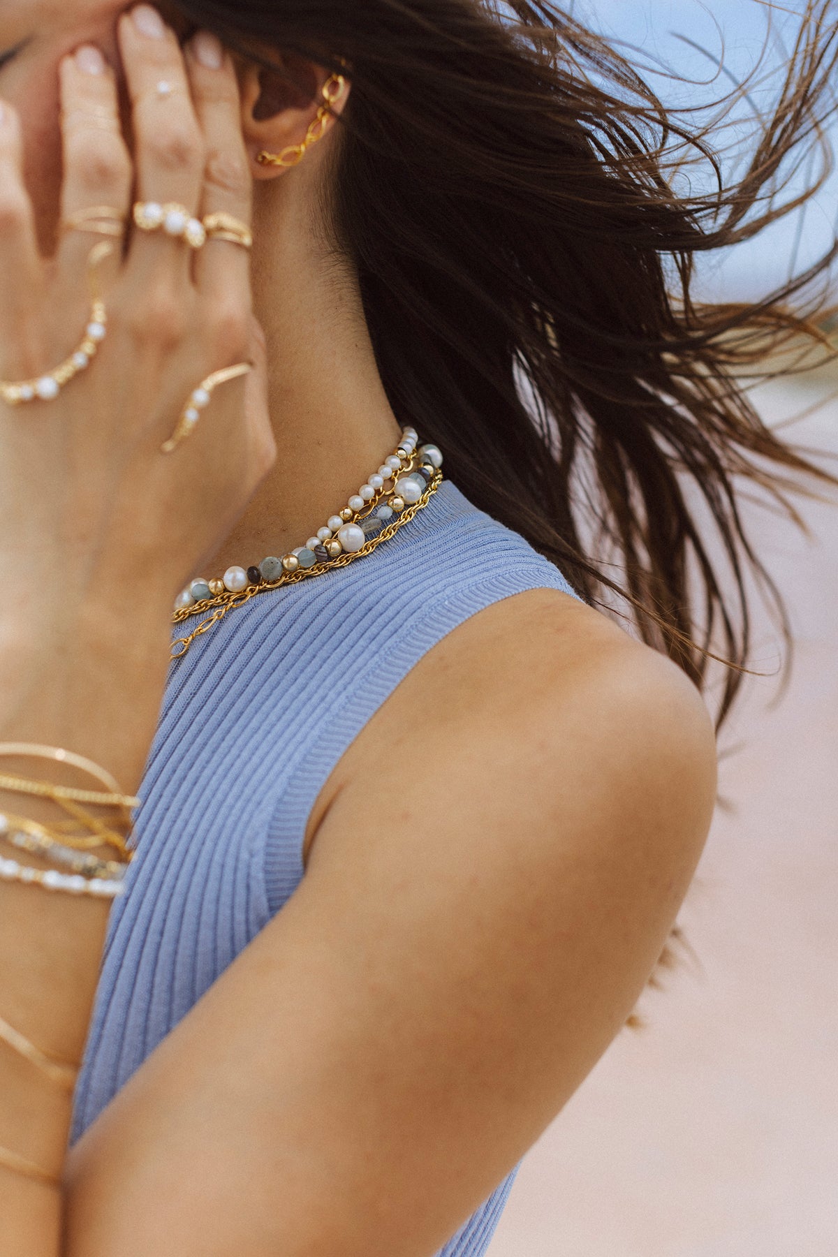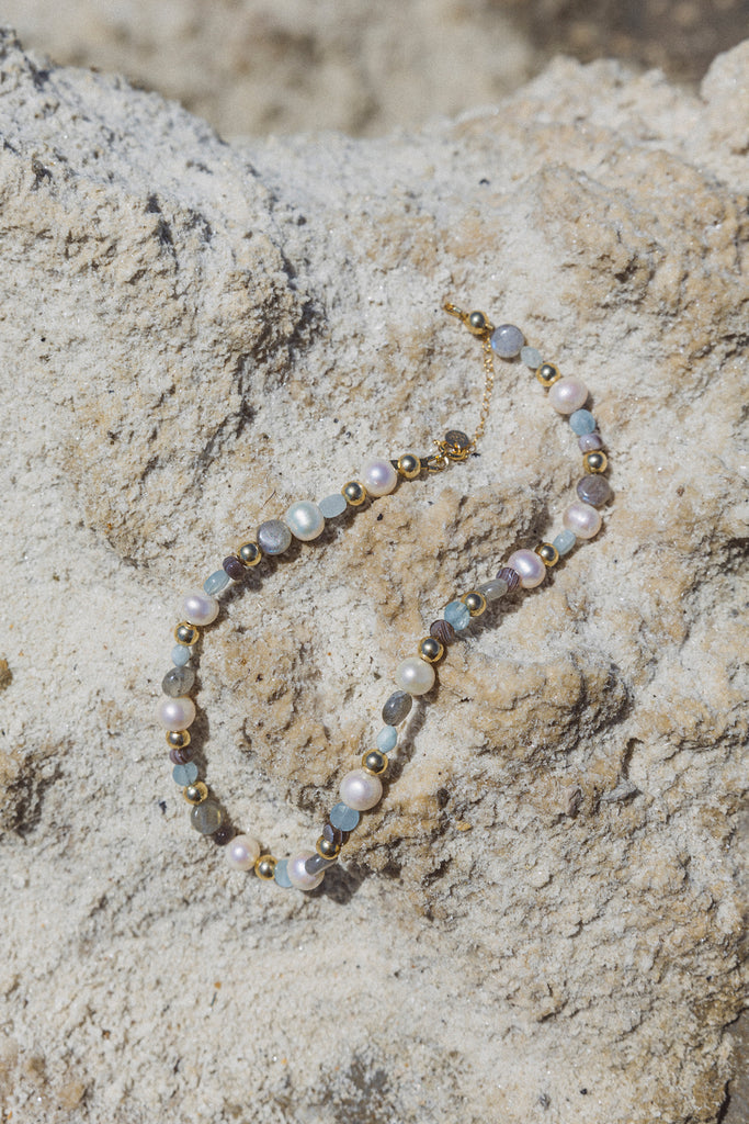 Pièce éclatante et apaisante, ce collier Nina capte l’énergie douce et mystérieuse des pierres naturelles aux nuances profondes. Saphir, Labradorite et Aigue-marine s’allient aux perles d’or et à la perle de culture pour créer une parure élégante, inspirée par la lumière cristalline des ciels d’hiver.