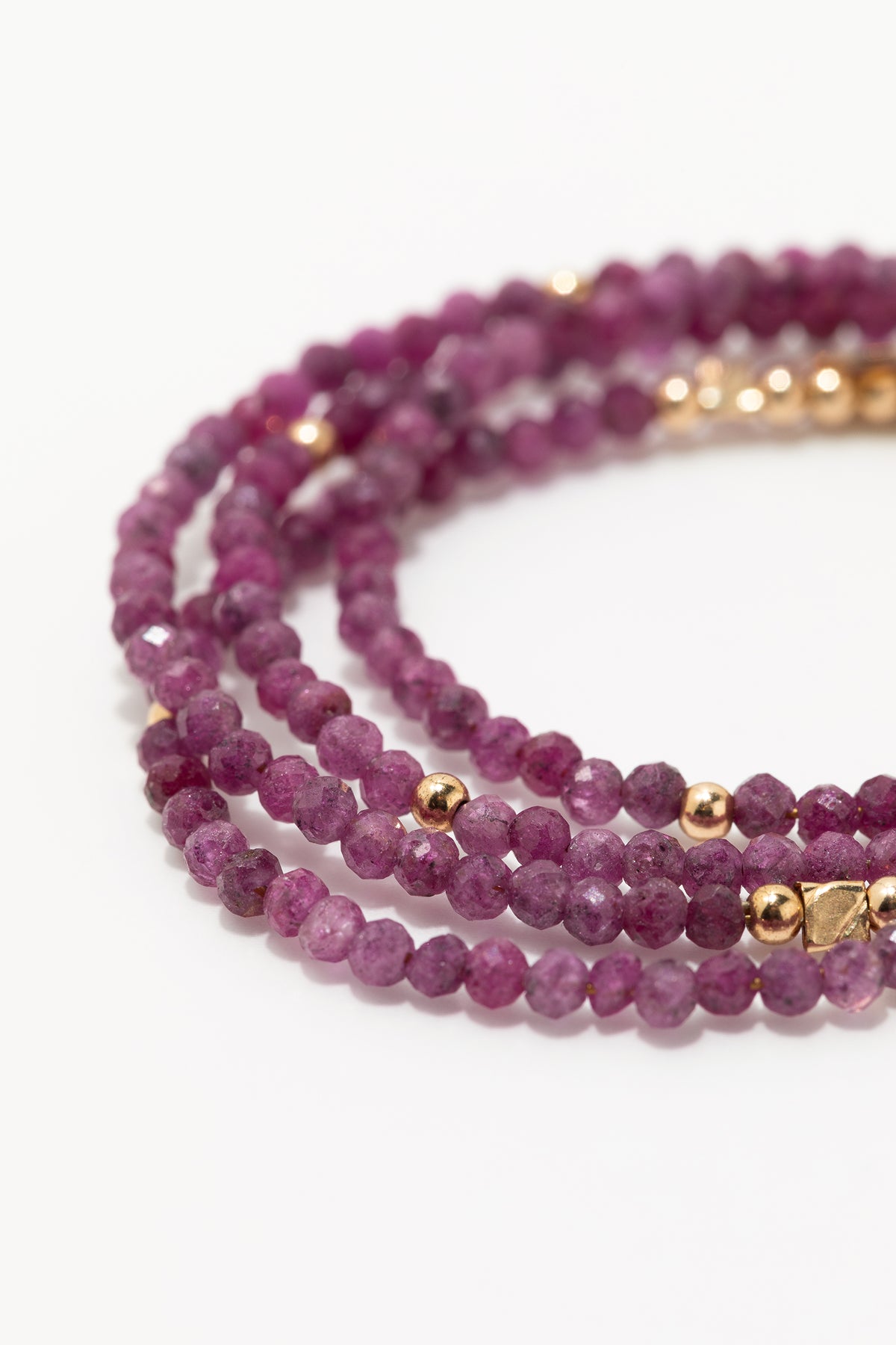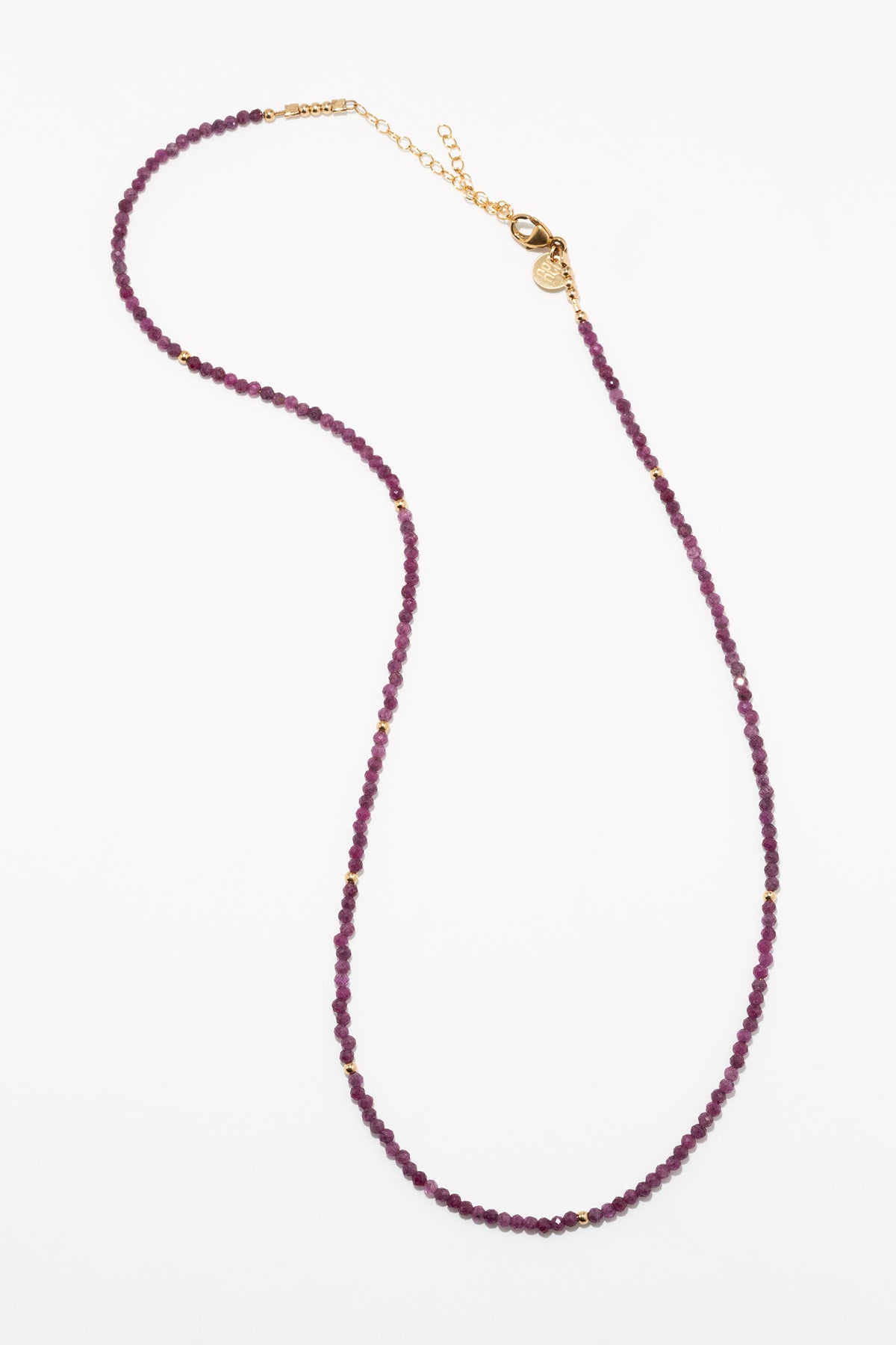 Un enfilage de perles de rubis, ponctué de perles d’or. Ce collier invite à la création, pensé pour accueillir nos pendentifs et composer des associations uniques.