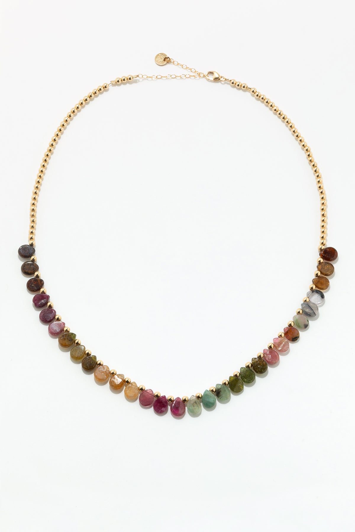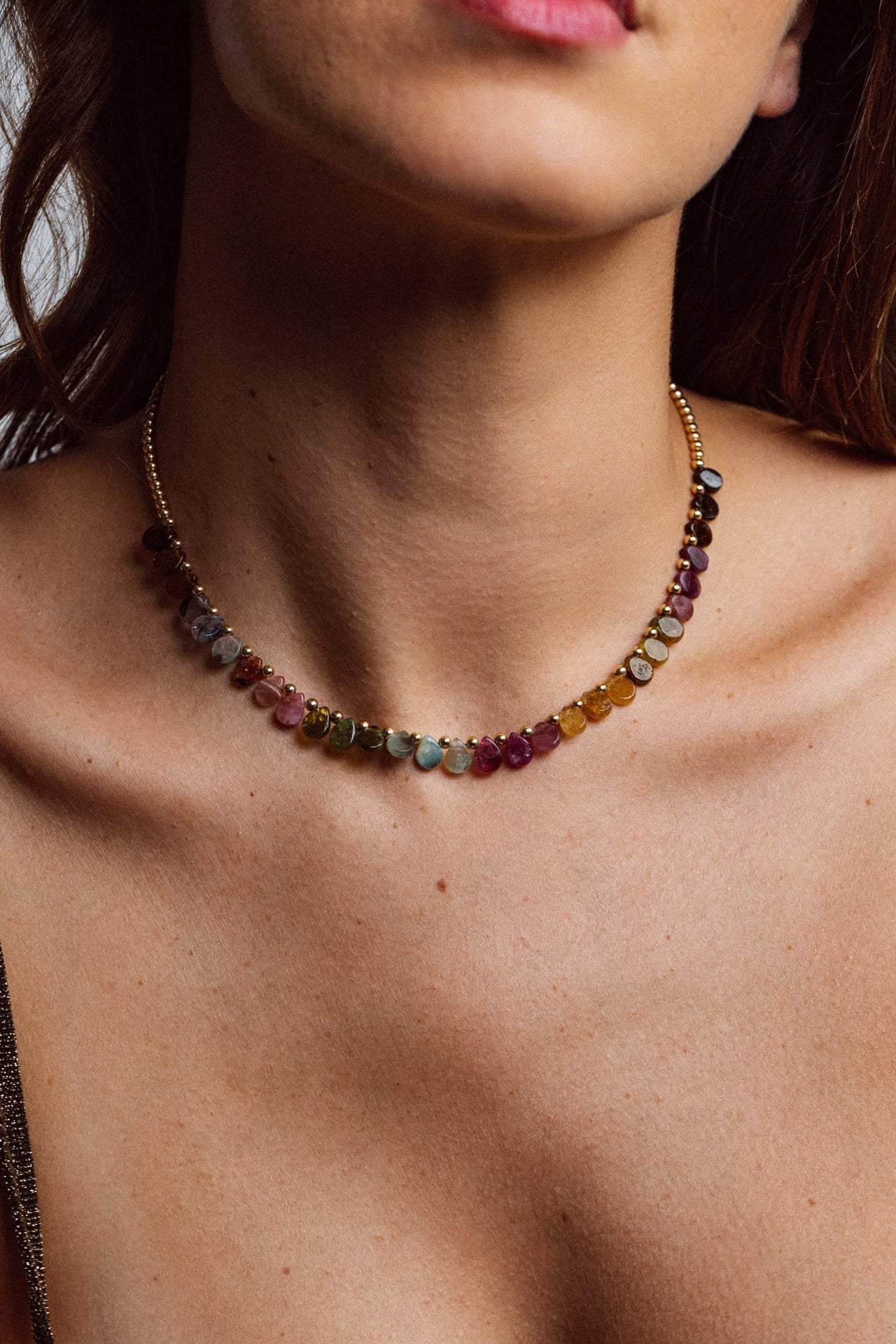 Ce collier esquisse un motif floral à travers un enfilage harmonieux de pierres en forme de pétales en tourmalines multicolores.