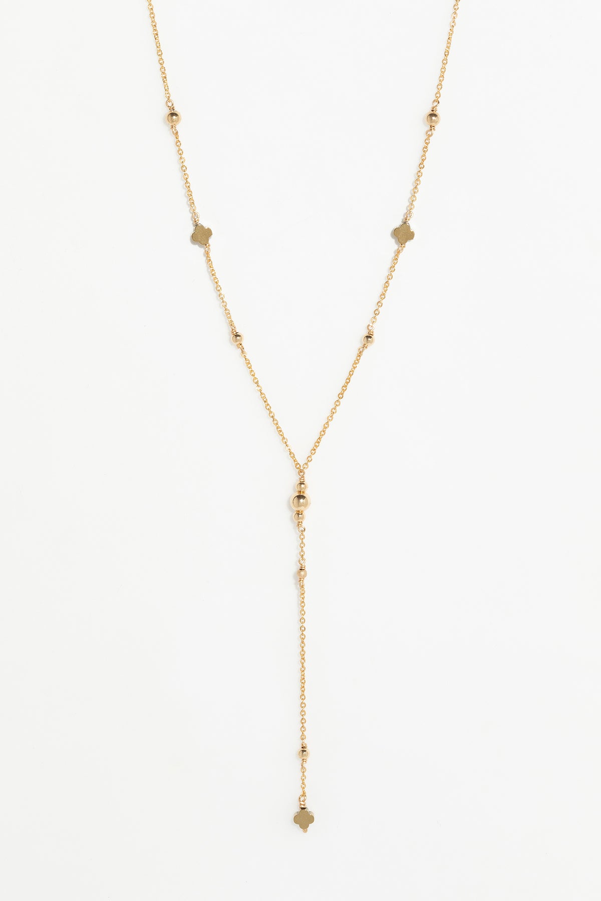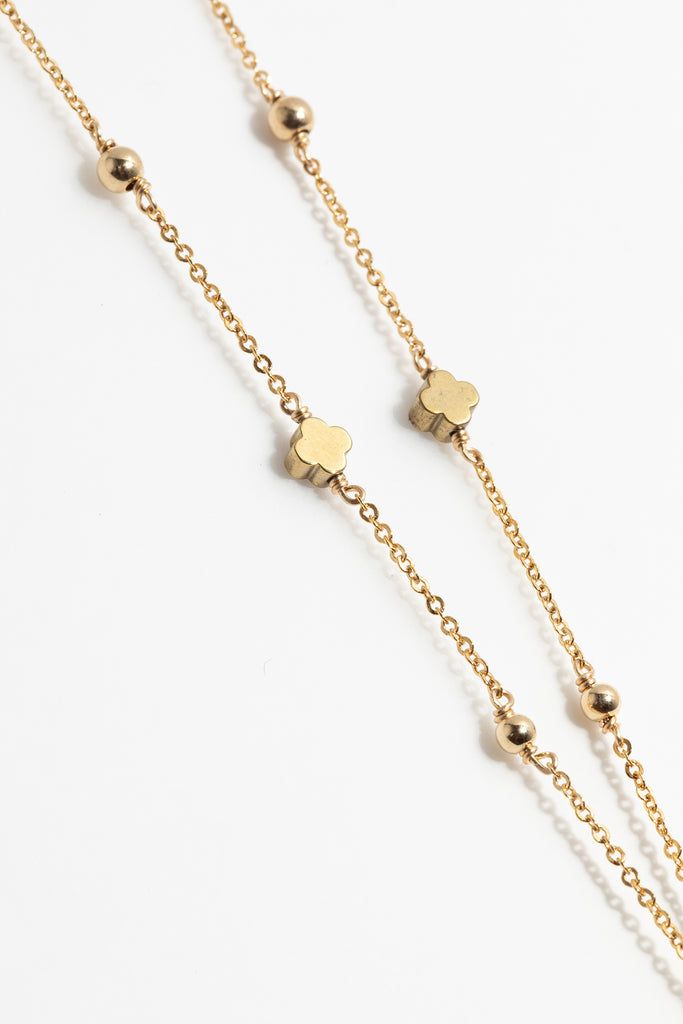 Collier Amaya, inspiré du style rosary, orné de pyrites en forme de trèfle. Ce bijou allie élégance et modernité pour sublimer le décolleté avec délicatesse. Sa chaîne fine et son design épuré en font une pièce versatile, parfaite pour habiller aussi bien un look quotidien que plus habillé.