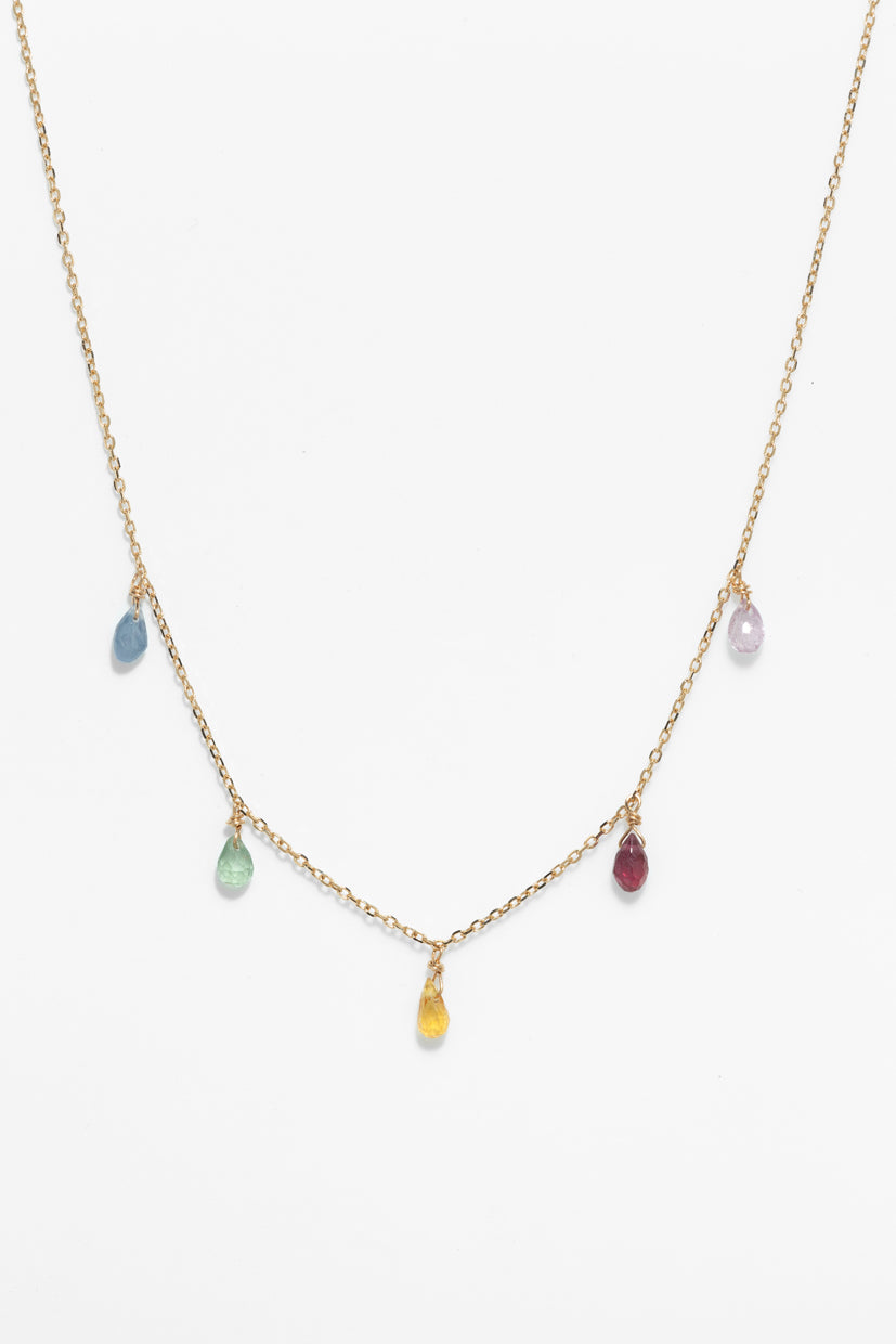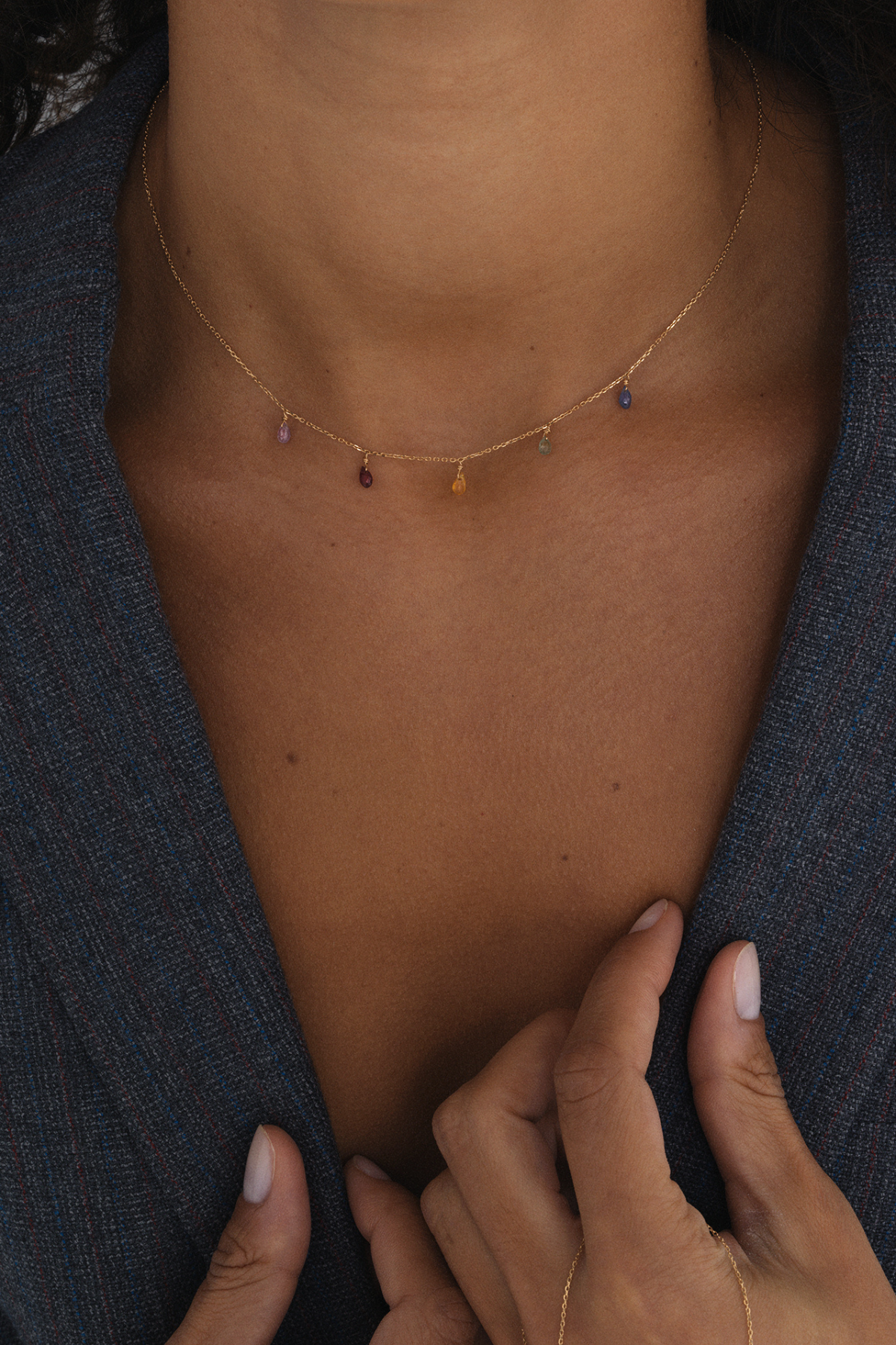 Une chaîne d’or 18 carats s’enroule avec délicatesse autour du cou, ponctué de saphirs multicolores qui captent la lumière à chaque mouvement. Chaque pierre, subtilement choisie, vient illuminer ce collier d’une touche précieuse et vibrante.