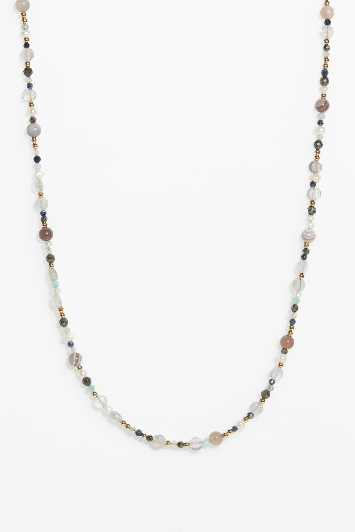 Chacune d'elles enfilées à la main, l'alternance minutieuse de gabarits dévoile une surface asymétrique aux reflets divins pour habiller le cou avec élégance.