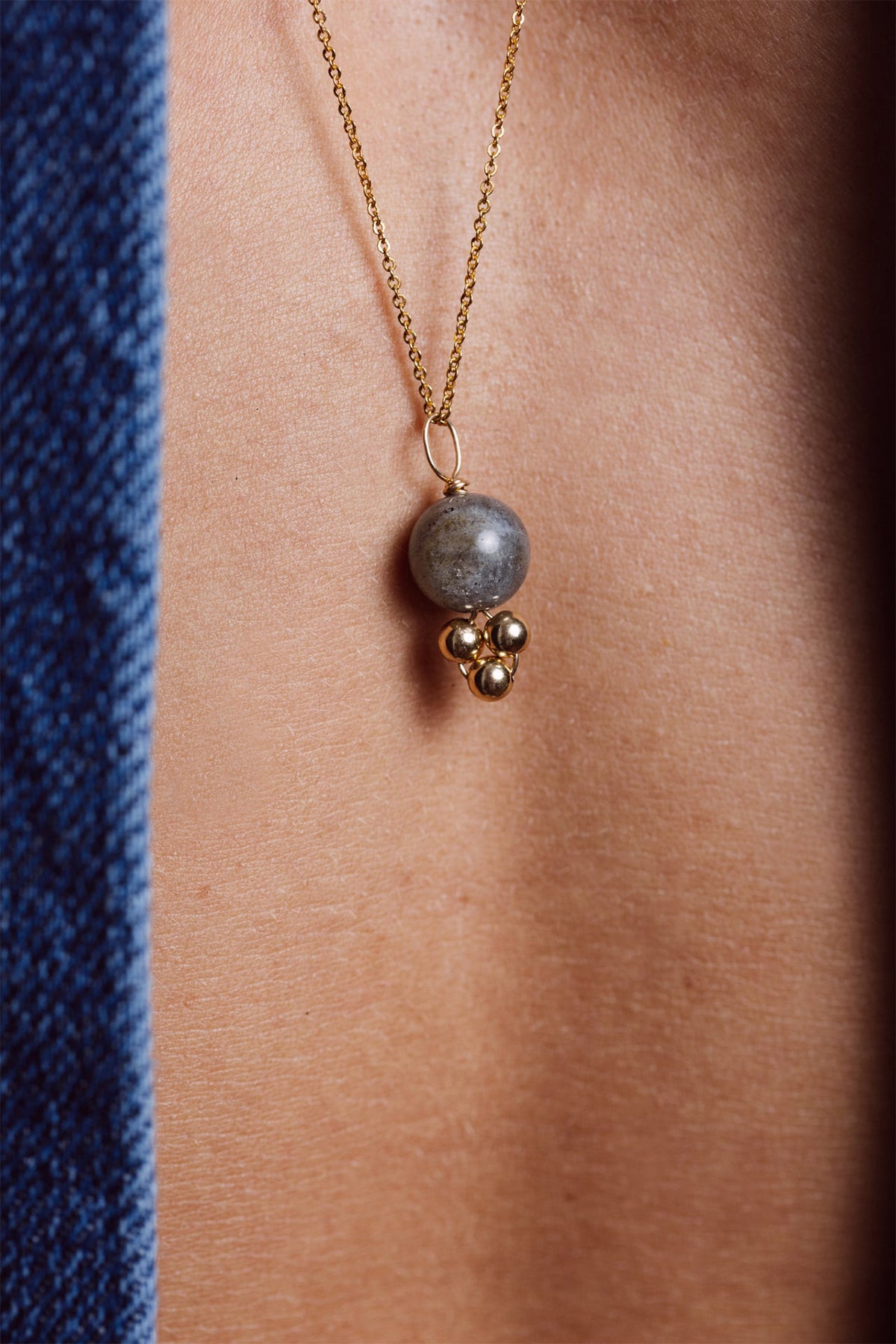 Le grand pendentif Gaïa unit la rondeur mystérieuse d’une labradorite à la finesse de trois petites perles lisses, tissées comme un grelot délicat.
