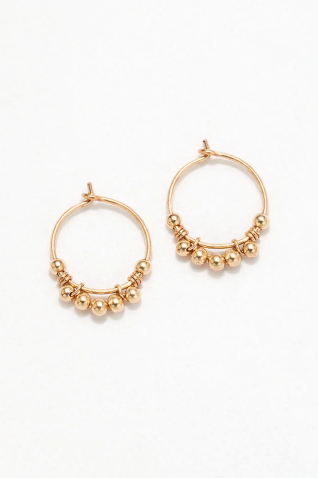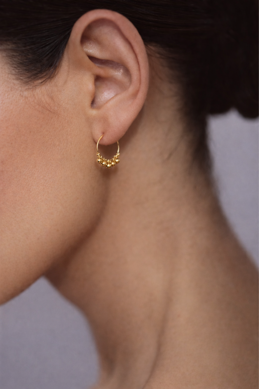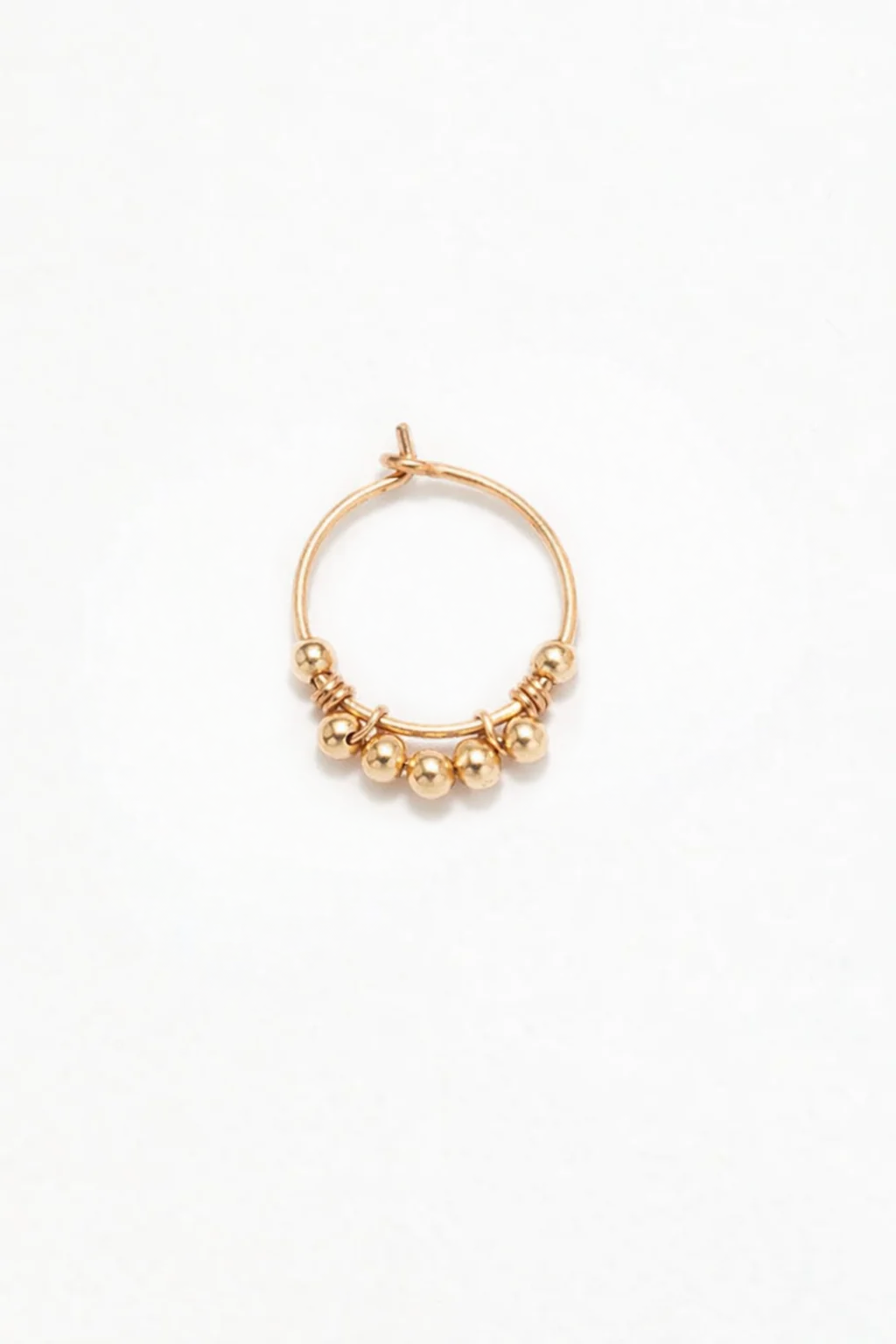 Bijoux singuliers, les mini créoles Priya mettent à l'honneur un savoir artisanal propre à la maison, l'art du fil. Sur un anneau formé d'un fil d'or, sont tissées une succession de perles dorées afin d'habiller l'oreille avec subtilité.